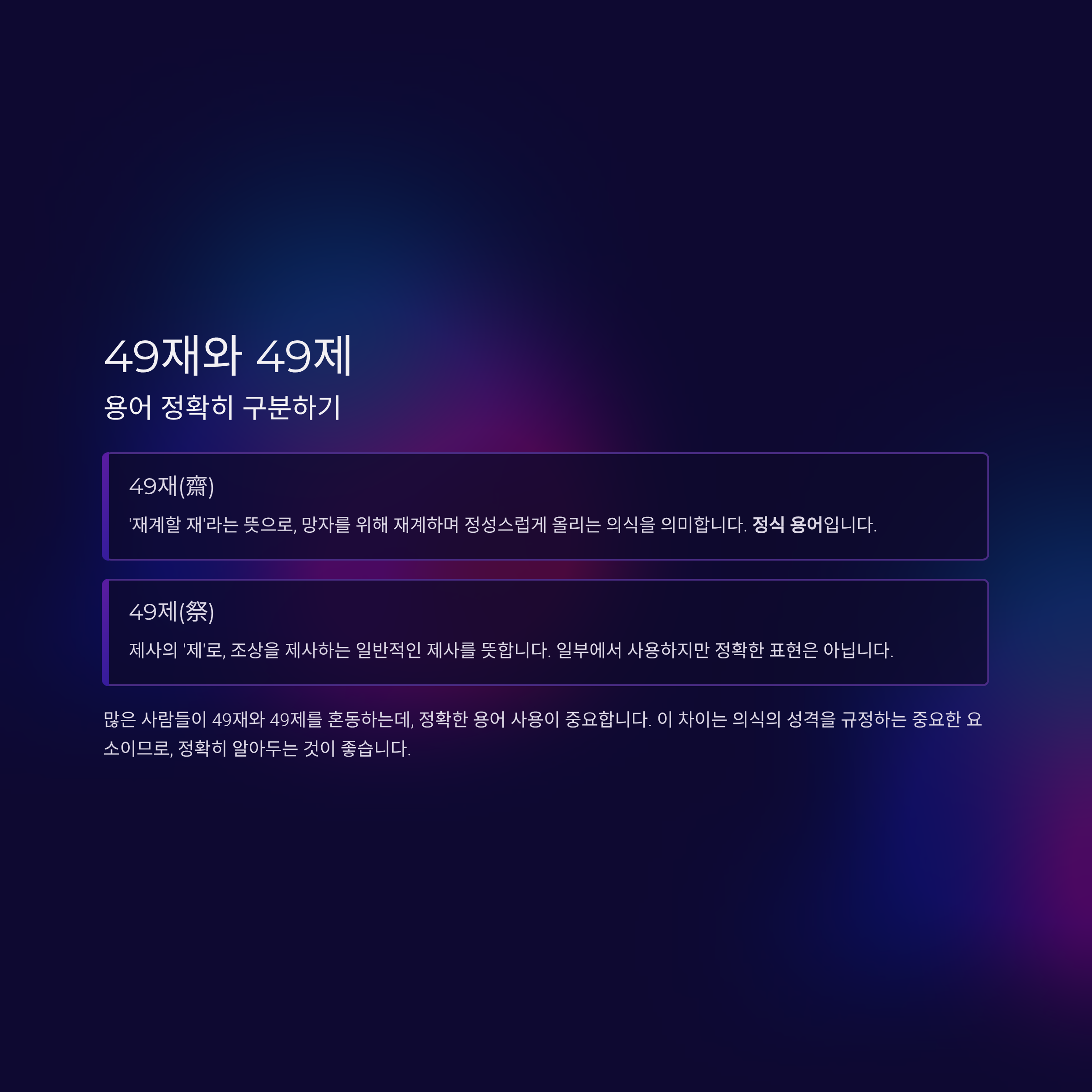 많은 사람들이 49재와 49제를 혼동하는데, 정확한 용어 사용이 중요합니다. 49재(齋)는 '재계할 재'라는 뜻으로, 망자를 위해 재계하며 정성스럽게 올리는 의식을 의미합니다. 반면 49제(祭)는 제사의 '제'로, 조상을 제사하는 일반적인 제사를 뜻합니다.