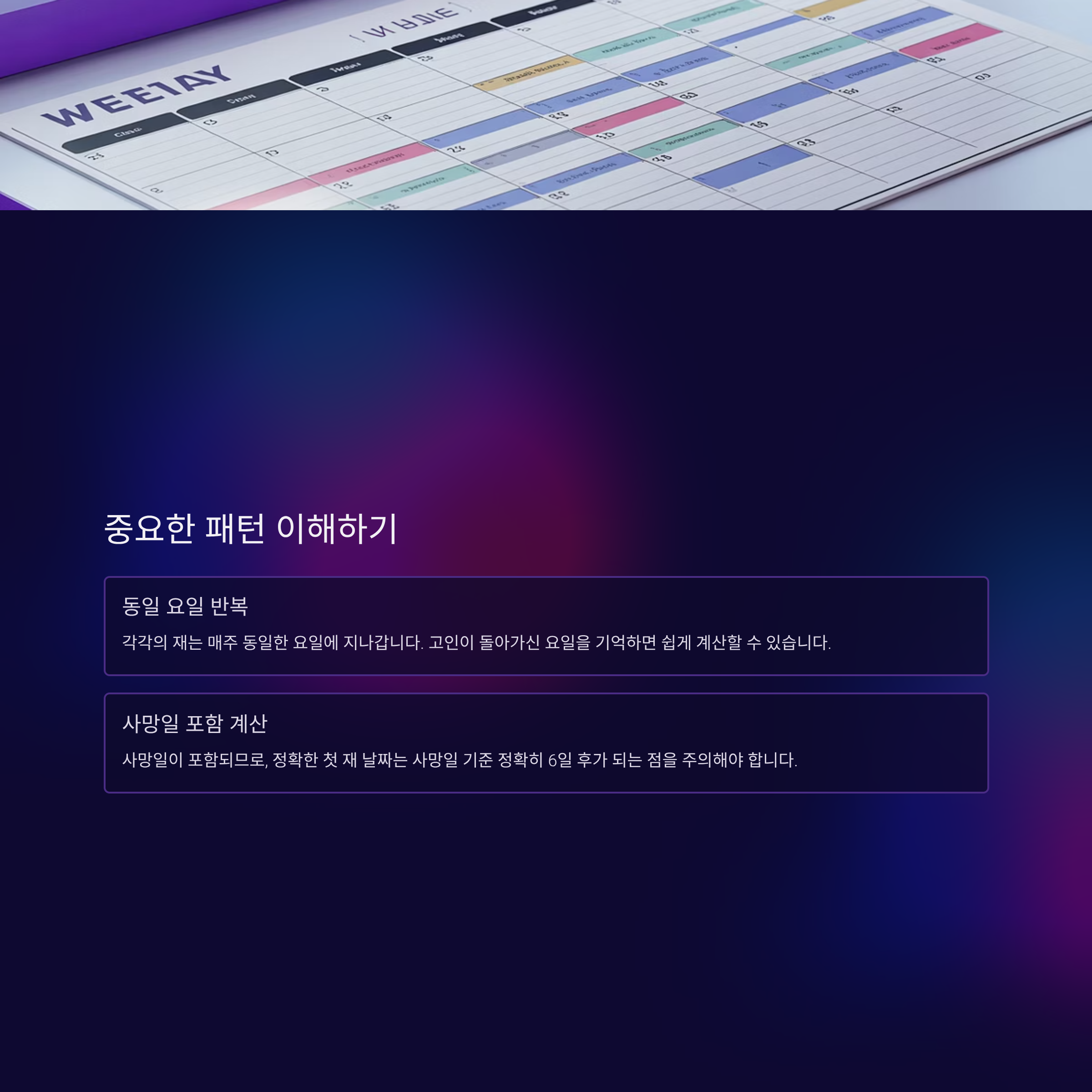 각각의 재는 매주 동일한 요일에 지나갑니다. 이는 49재를 기억하기 쉽게 만듭니다. 고인이 돌아가신 요일을 기억하면, 매주 같은 요일에 재가 있다는 것을 바로 알 수 있습니다. 다만 사망일이 포함되므로, 정확한 첫 재 날짜는 사망일 기준 정확히 6일 후가 되는 점을 주의해야 합니다.