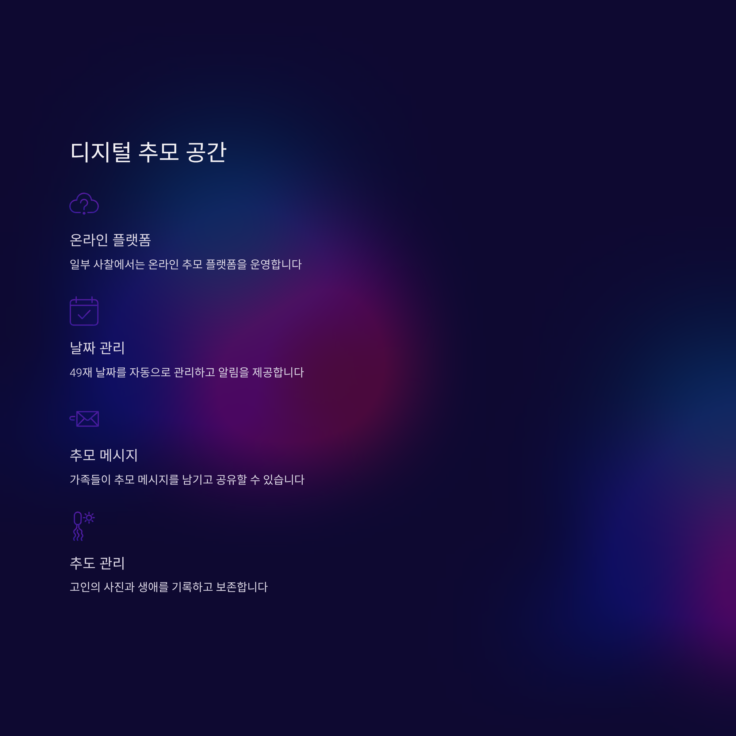 일부 사찰에서는 온라인 추모 플랫폼을 운영해 49재 날짜 관리, 추모 메시지 기록, 고인 추도 관리 등을 돕고 있습니다.