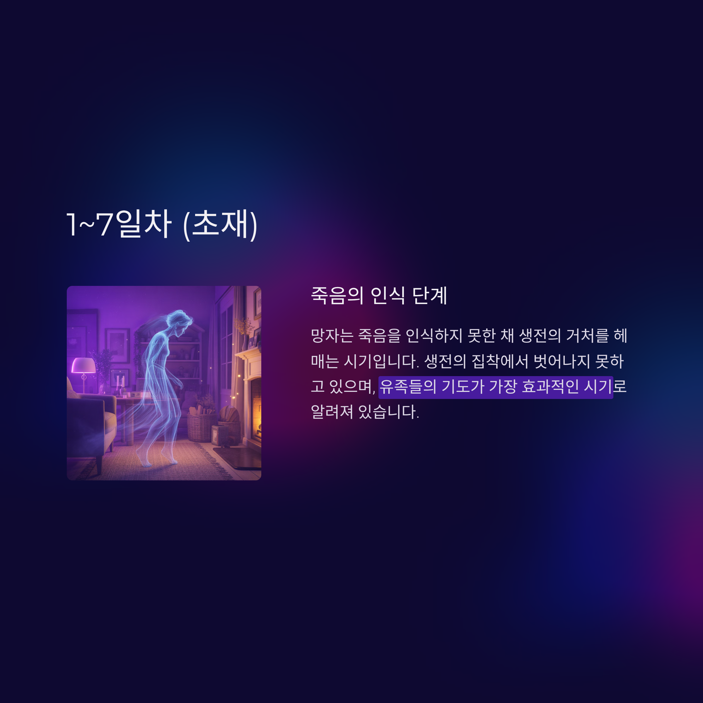 망자는 죽음을 인식하지 못한 채 생전의 거처를 헤매는 시기입니다. 생전의 집착에서 벗어나지 못하고 있으며, 유족들의 기도가 가장 효과적인 시기로 알려져 있습니다.