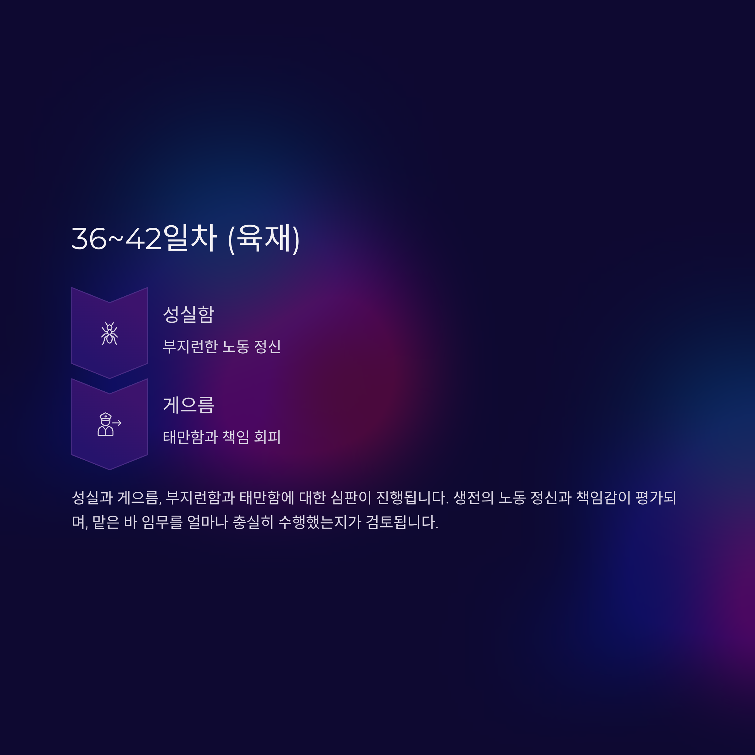 성실과 게으름, 부지런함과 태만함에 대한 심판이 진행됩니다. 생전의 노동 정신과 책임감이 평가됩니다.