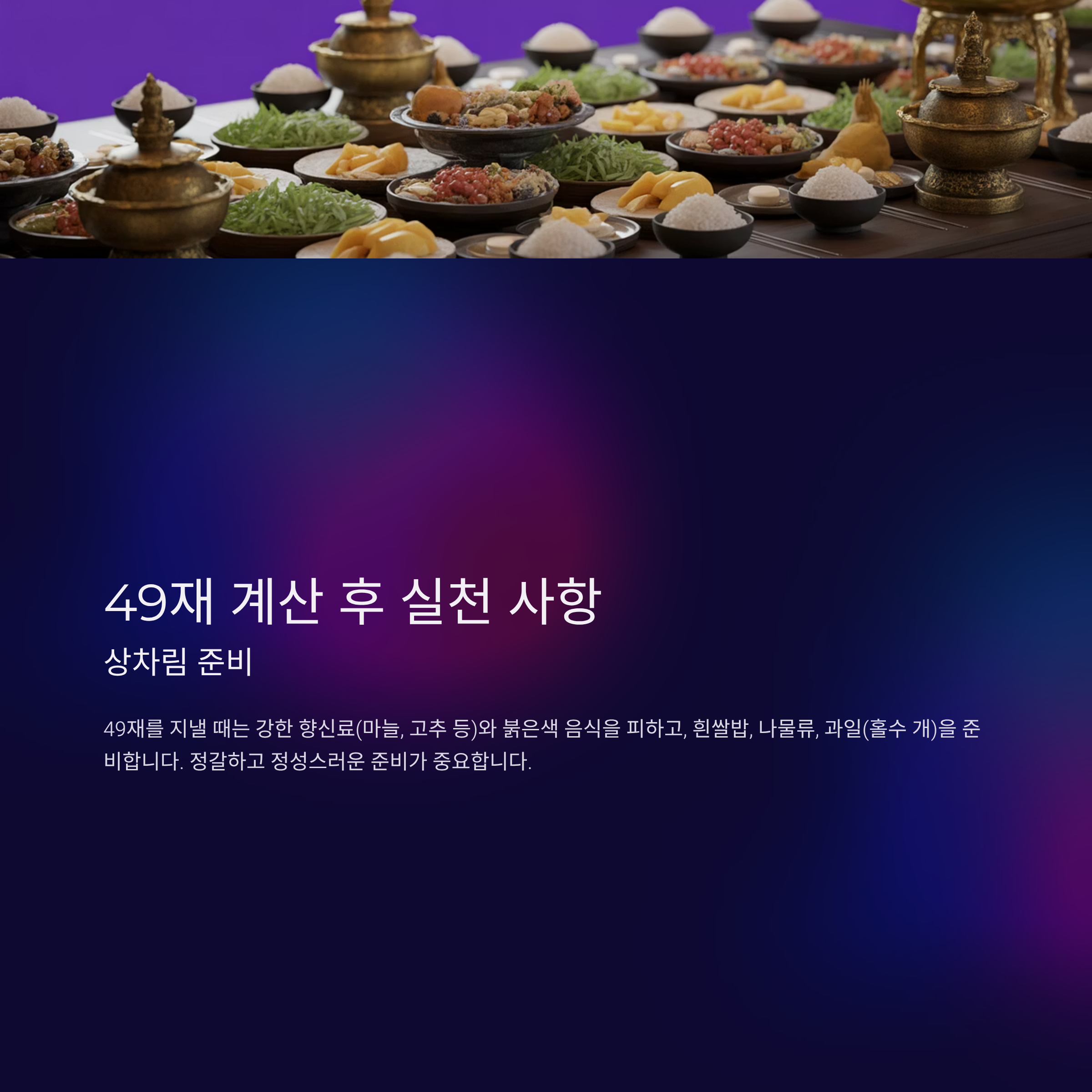 49재를 지낼 때는 강한 향신료(마늘, 고추 등)와 붉은색 음식을 피하고, 흰쌀밥, 나물류, 과일(홀수 개)을 준비합니다.