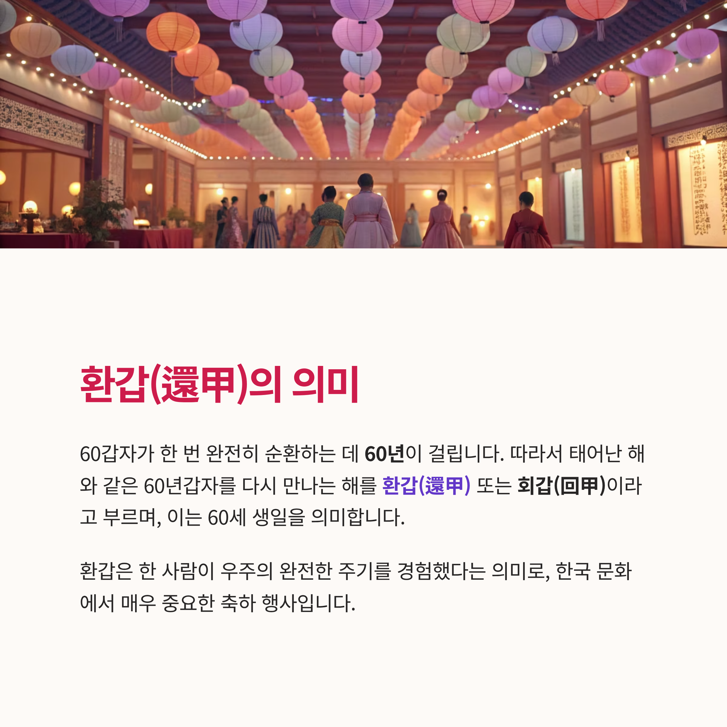 60갑자가 한 번 완전히 순환하는 데 60년이 걸립니다. 따라서 태어난 해와 같은 60년갑자를 다시 만나는 해를 환갑(還甲) 또는 **회갑(回甲)**이라고 부르며, 이는 60세 생일을 의미합니다.