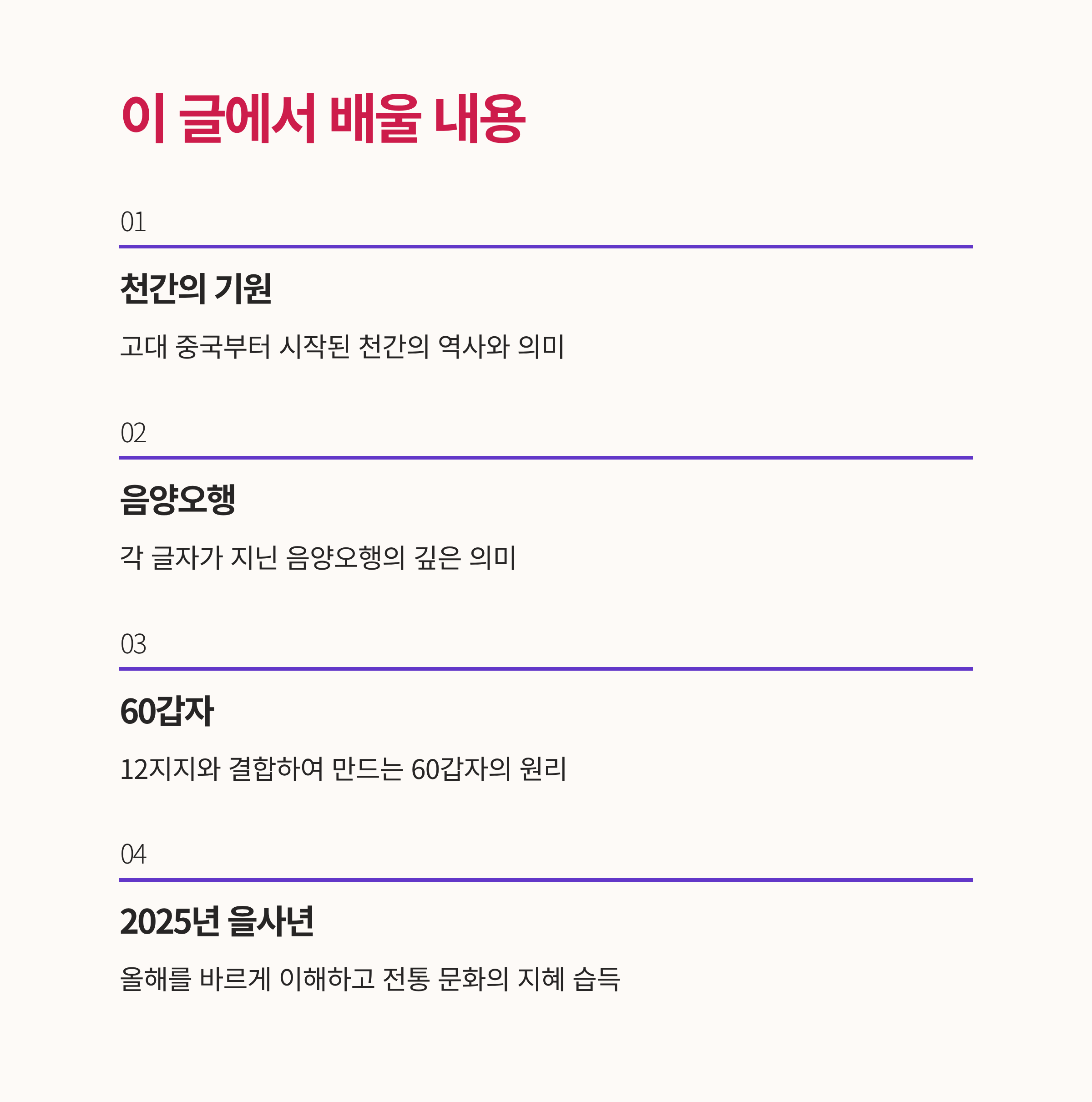 "을사년", "갑진년"이라는 말을 들어봤지만 정확히 무엇인지 모르셨나요? 갑을병정 무기경신임계는 한국 전통 문화의 핵심을 이루는 10천간입니다!
