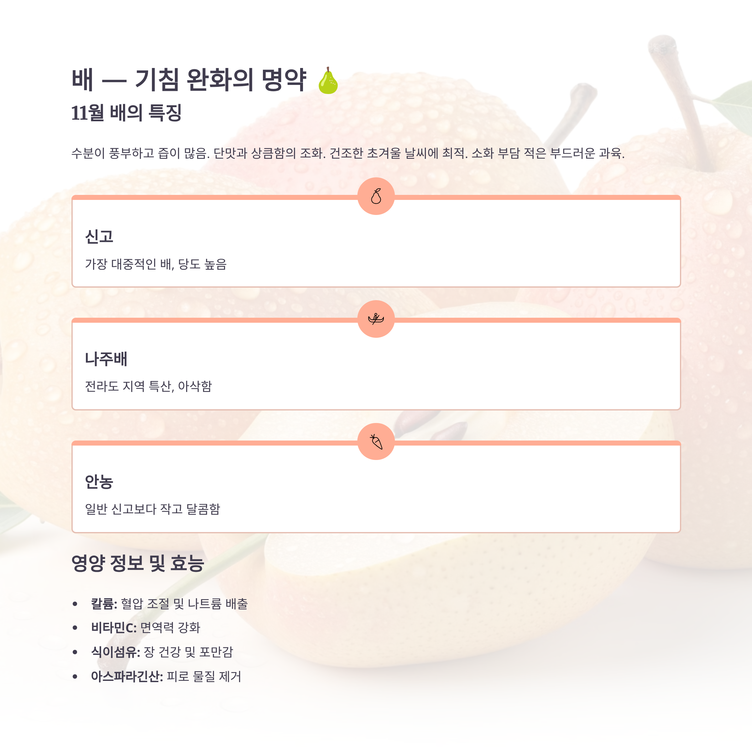 11월은 단순한 계절 변화가 아니라 우리 몸의 면역력이 급격히 필요해지는 중요한 시점입니다! 추워지는 날씨 속에서 체력이 약해지고 감기가 유행하기 시작할 때, 바로 이 시기의 제철 과일이 최고의 건강 파수꾼이 되어줍니다.