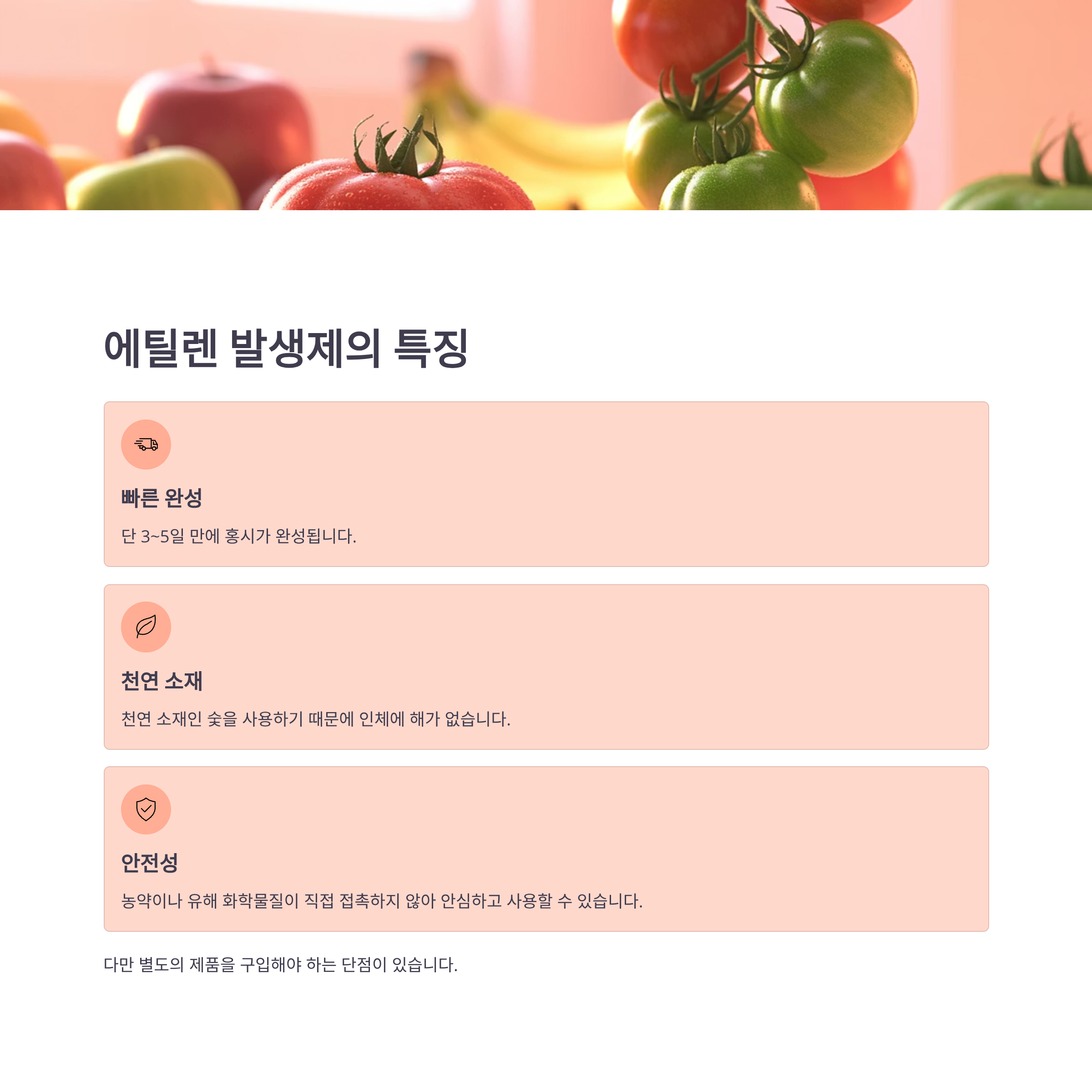 농촌진흥청에서 개발한 숯을 이용한 에틸렌 발생제는 가장 최신이면서도 효과적인 방법입니다. 흡착성이 좋은 숯에 에틸렌 가스를 인위적으로 포화시켜 필요할 때 서서히 방출하도록 만든 제품입니다.