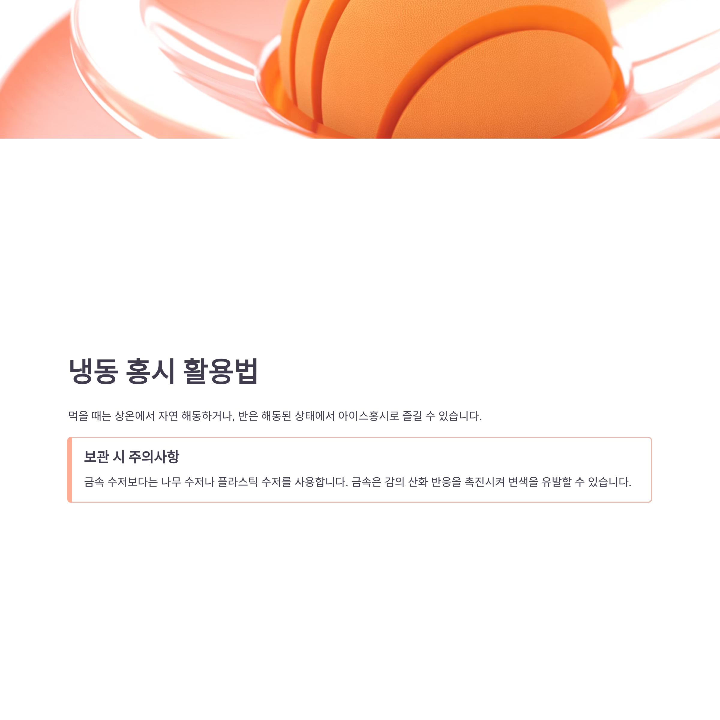 장기 보관을 원한다면 냉동 보관이 최고의 방법입니다. 개별로 랩에 싸거나 지퍼백에 넣어 냉동실에 보관하면 2개월까지 보관 가능합니다. 먹을 때는 상온에서 자연 해동하거나, 반은 해동된 상태에서 아이스홍시로 즐길 수 있습니다.