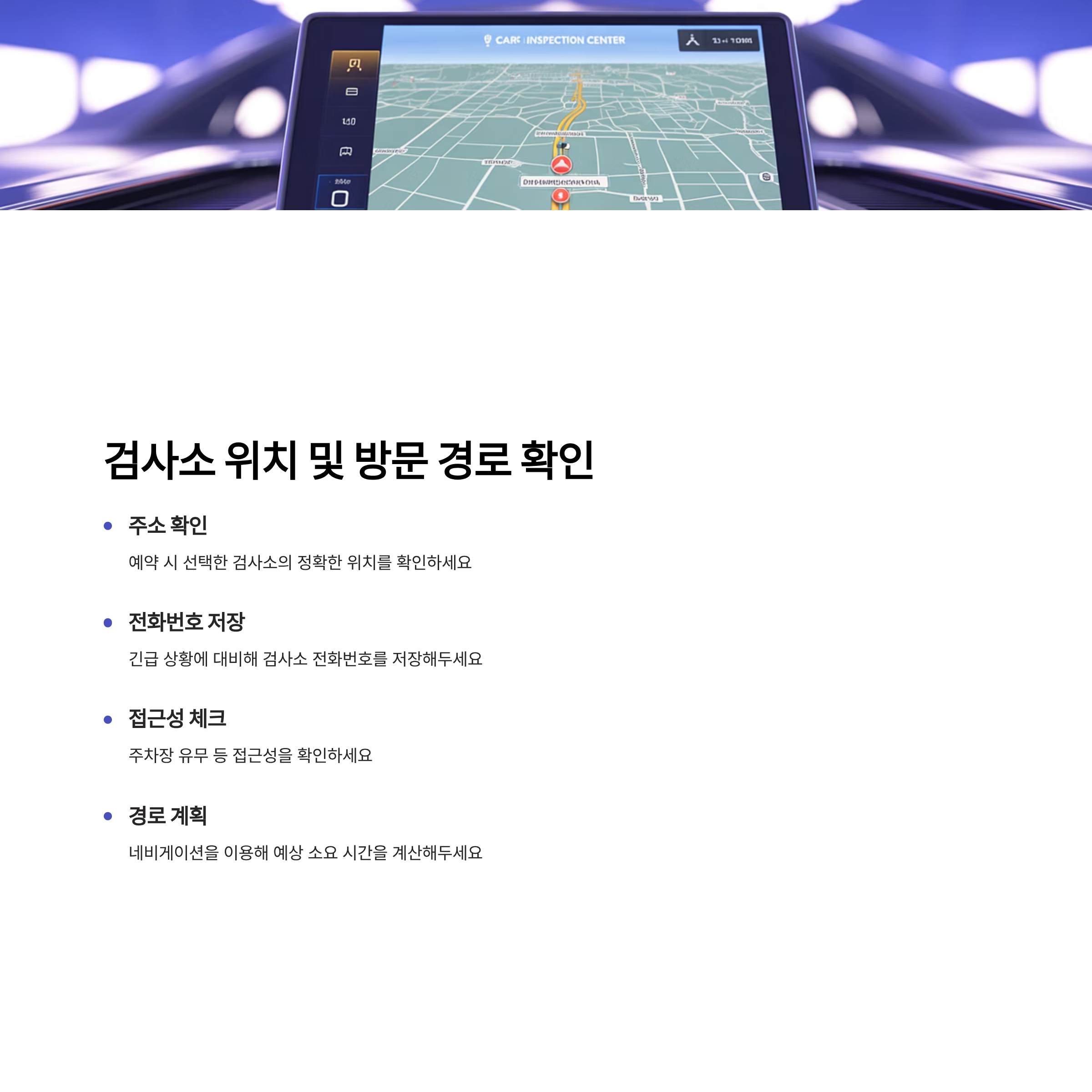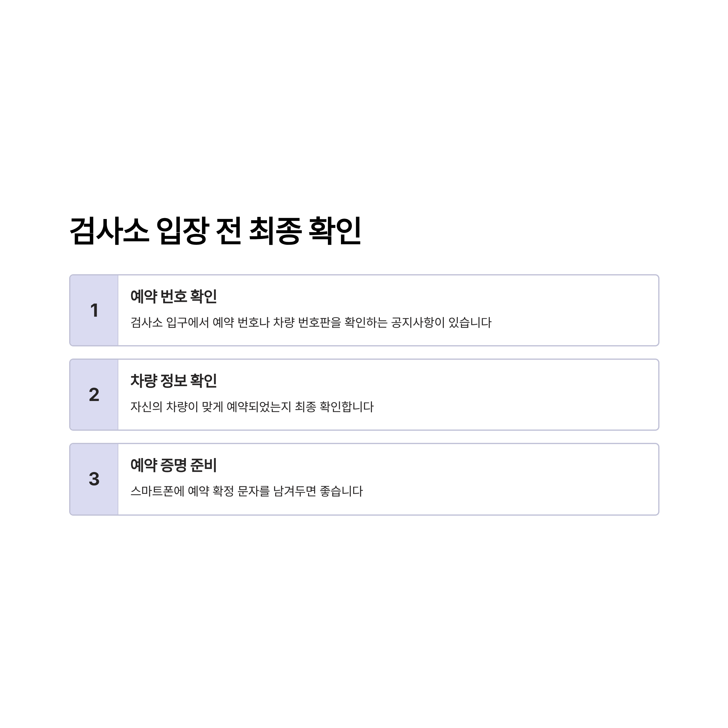예약 시 선택한 검사소의 정확한 위치와 방문 경로를 미리 확인하세요. 주소, 전화번호, 접근성(주차장 유무 등)을 확인하고, 네비게이션을 이용해 예상 소요 시간을 계산해두면 예약 시간에 늦지 않고 도착할 수 있습니다.