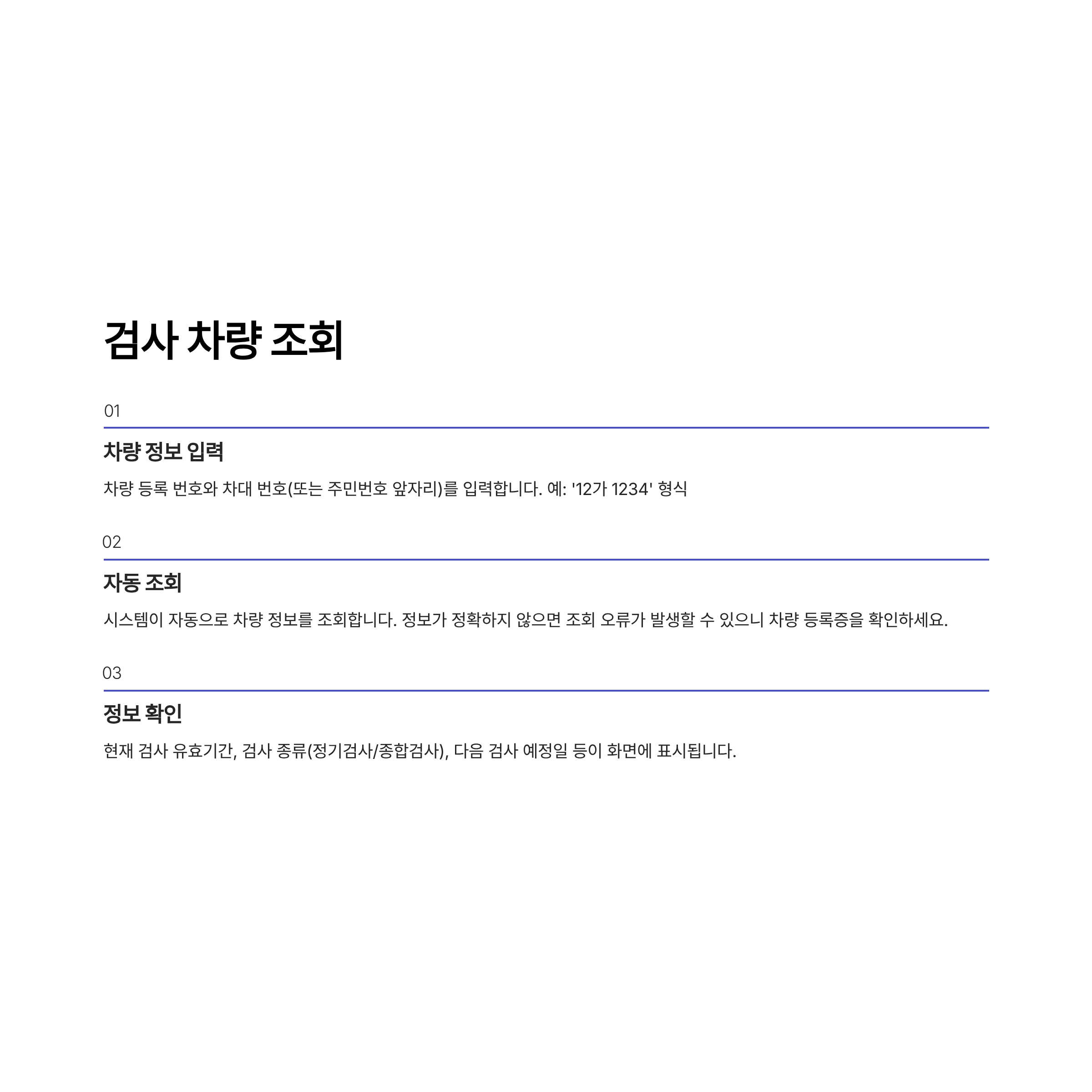 메뉴를 선택한 후 다음 단계는 자신의 차량 정보를 입력하는 것입니다. 필요한 정보는 차량 등록 번호와 차대 번호(또는 주민번호 앞자리)입니다. 예를 들어 '12가 1234' 형식의 차량 등록 번호를 입력하면 시스템이 자동으로 차량 정보를 조회합니다. 이때 정보가 정확하지 않으면 조회 오류가 발생할 수 있으니, 차량 등록증을 확인하면서 정확히 입력하세요. 차량이 조회되면 현재 검사 유효기간, 검사 종류(정기검사/종합검사), 다음 검사 예정일 등이 화면에 표시됩니다.