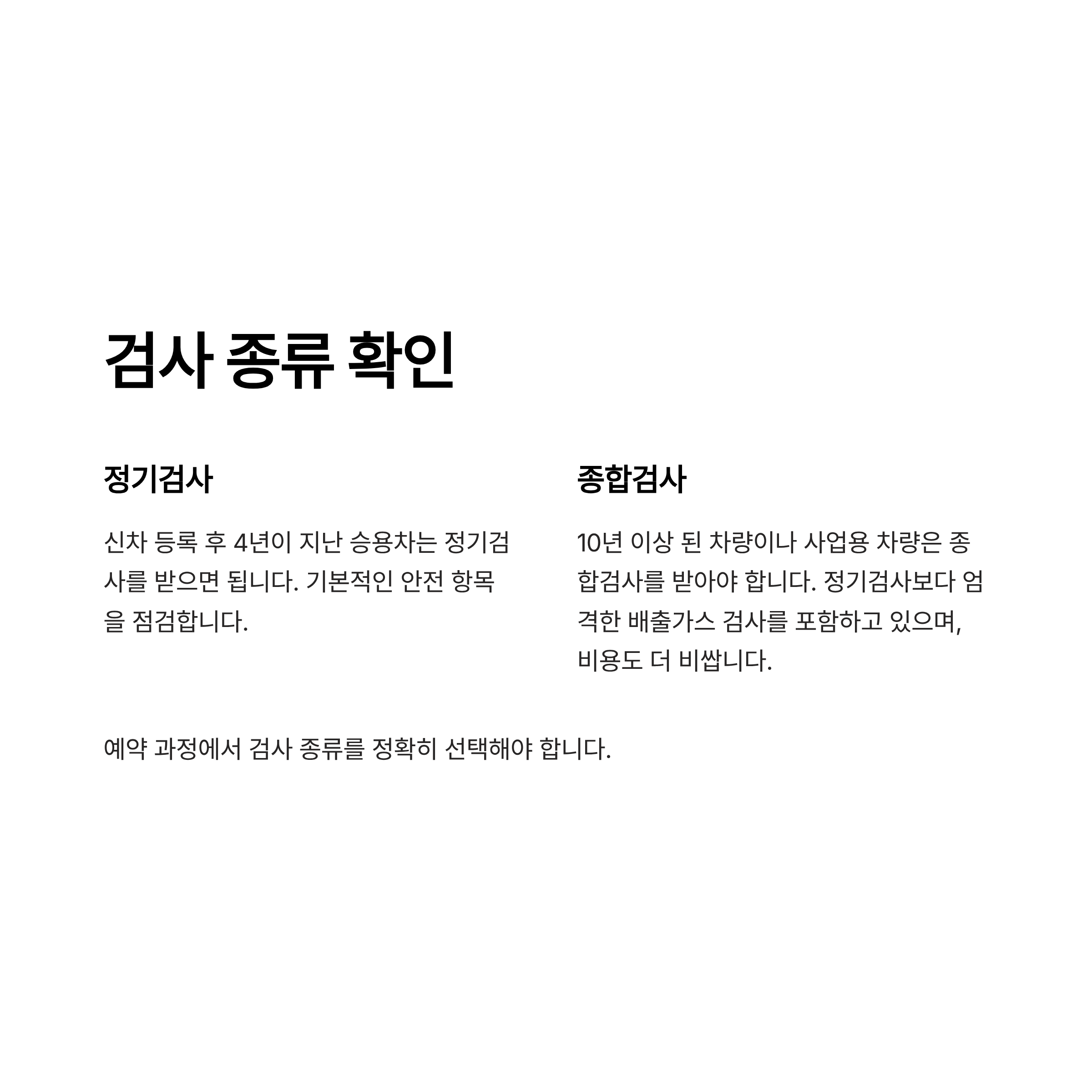 검사는 정기검사와 종합검사로 나뉩니다. 신차 등록 후 4년이 지난 승용차는 정기검사를 받으면 되고, 10년 이상 된 차량이나 사업용 차량은 종합검사를 받아야 합니다. 종합검사는 정기검사보다 엄격한 배출가스 검사를 포함하고 있으며, 비용도 더 비쌉니다. 예약 과정에서 검사 종류를 정확히 선택해야 합니다.