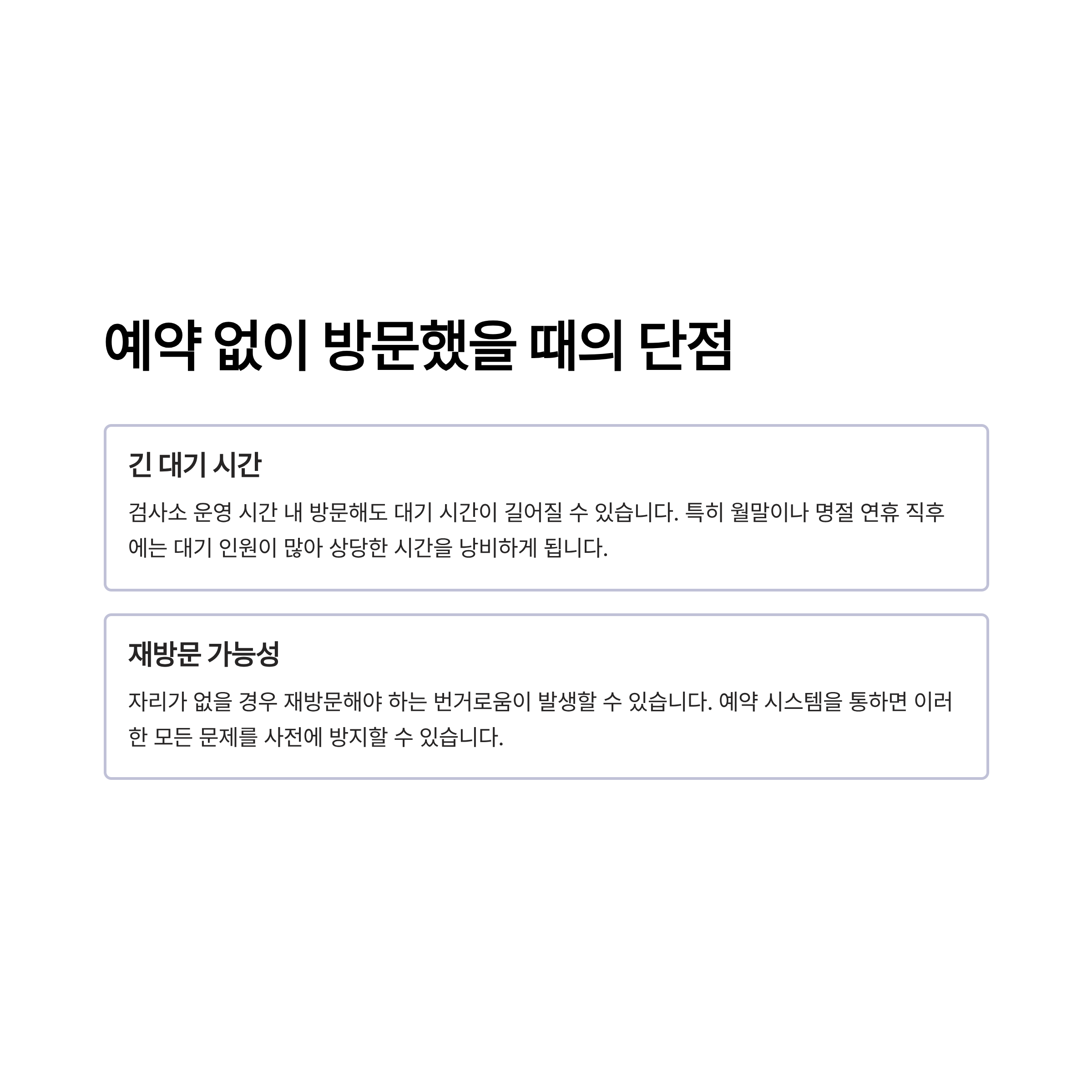 예약 없이 검사소에 직접 방문할 수도 있지만, 여러 가지 불편함이 발생합니다. 검사소 운영 시간 내에 방문해도 대기 시간이 길어질 수 있고, 특히 월말이나 명절 연휴 직후에는 대기 인원이 많아 상당한 시간을 낭비하게 됩니다. 또한 자리가 없을 경우 재방문해야 하는 번거로움도 발생할 수 있습니다. 예약 시스템을 통하면 이러한 모든 문제를 사전에 방지할 수 있습니다.