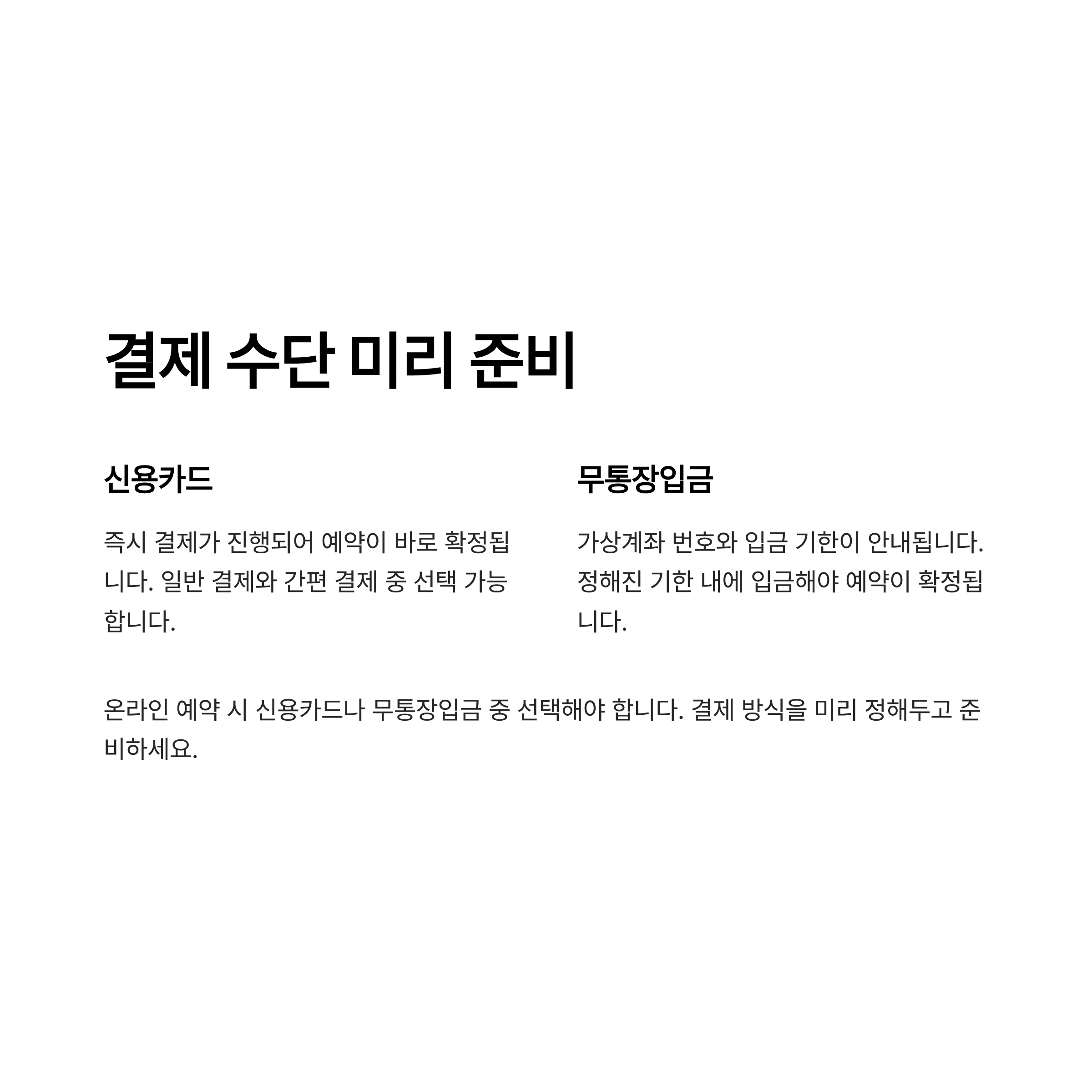 온라인 예약 시 신용카드나 무통장입금 중 선택해야 합니다. 신용카드는 즉시 결제되고, 무통장입금은 정해진 기한 내에 입금해야 예약이 확정됩니다. 결제 방식을 미리 정해두고 준비하세요.