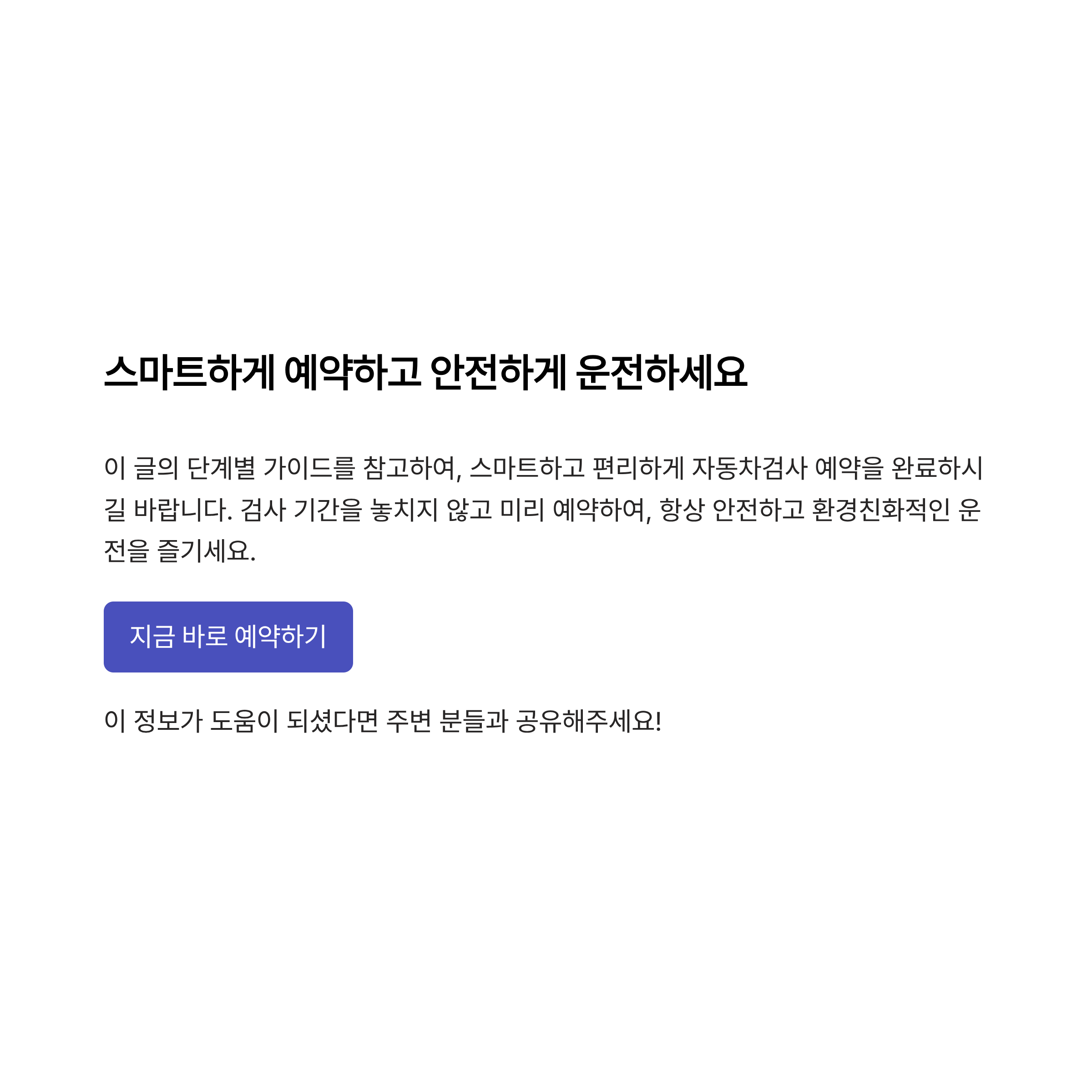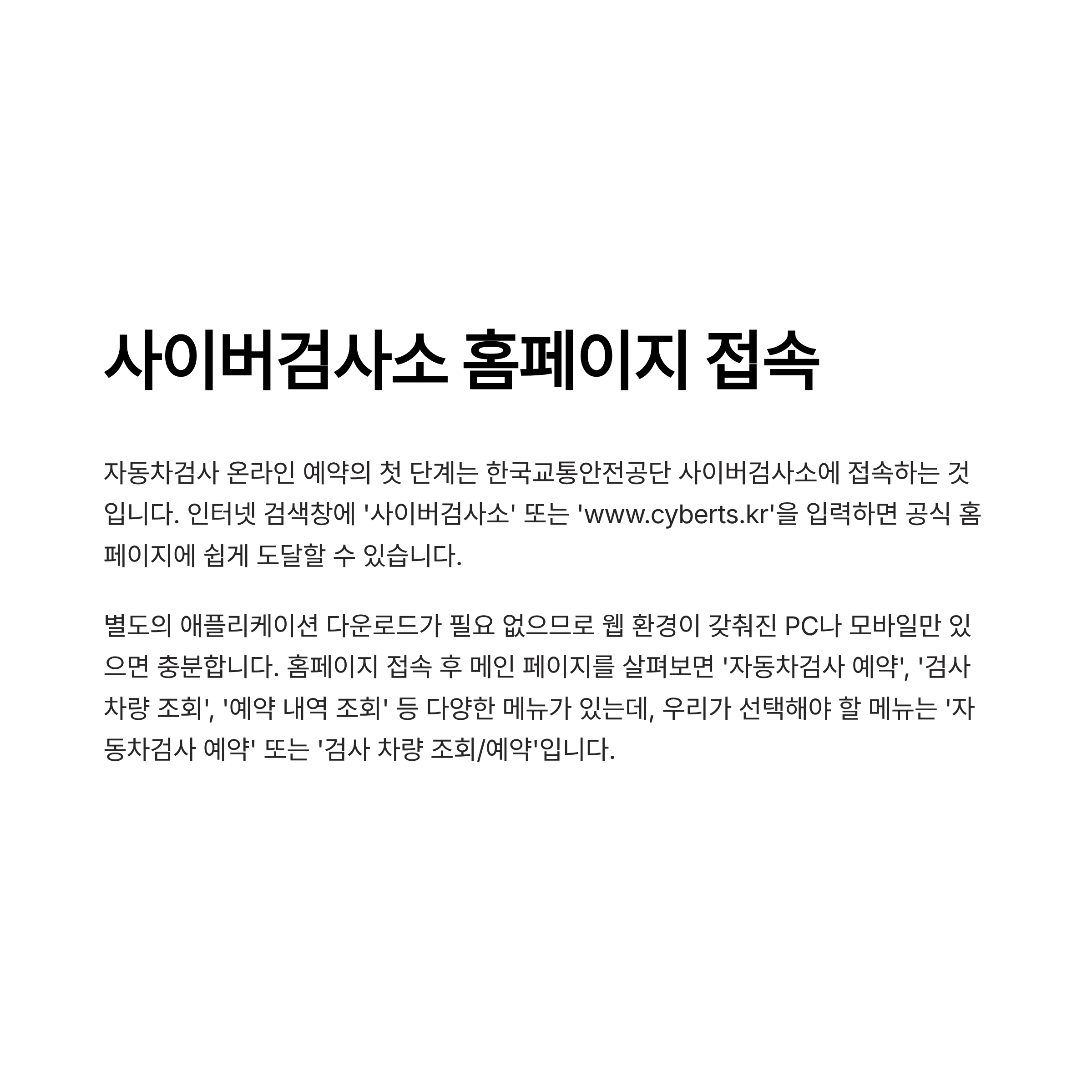 이 글의 단계별 가이드를 참고하여, 스마트하고 편리하게 자동차검사 예약을 완료하시길 바랍니다. 검사 기간을 놓치지 않고 미리 예약하여, 항상 안전하고 환경친화적인 운전을 즐기세요.