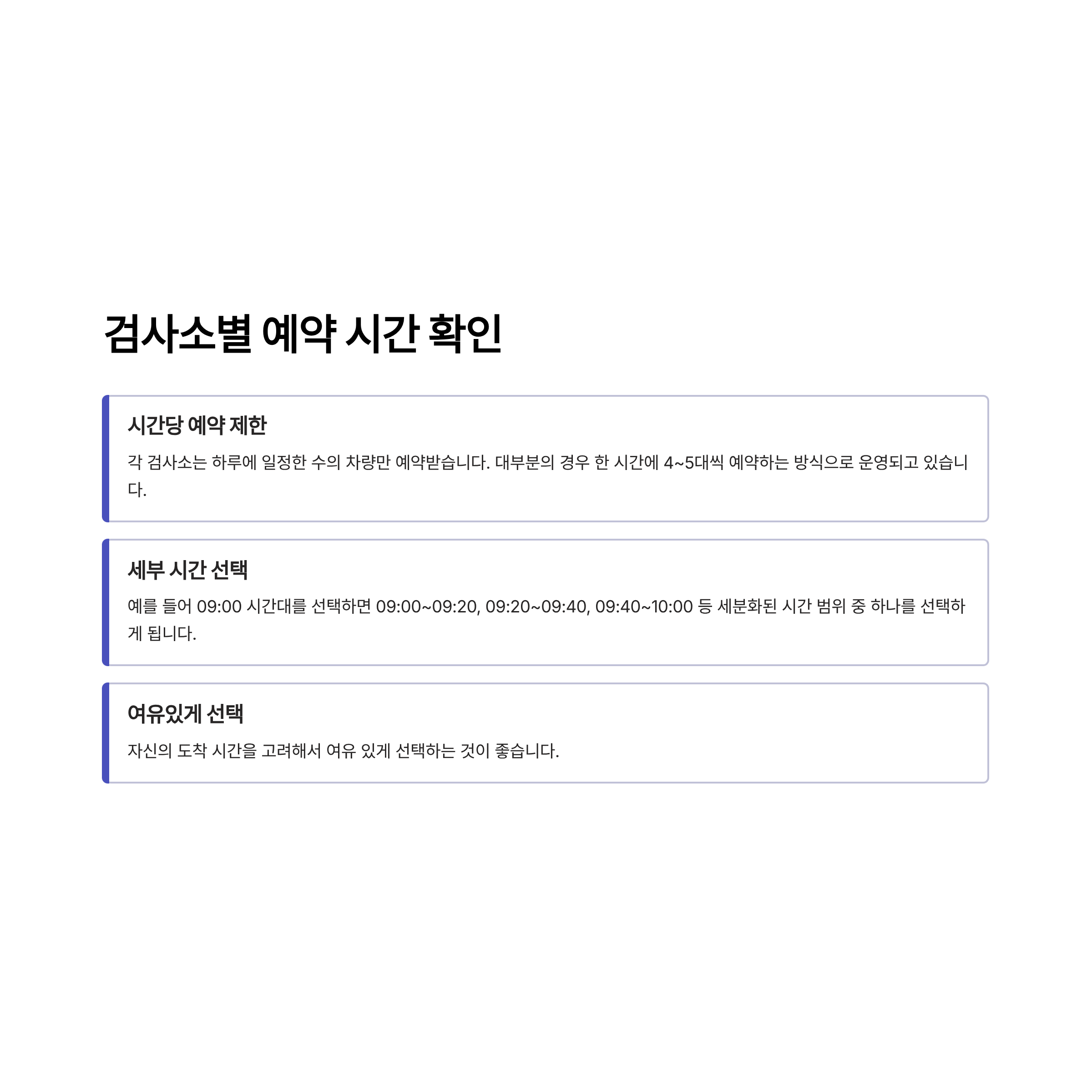 각 검사소는 하루에 일정한 수의 차량만 예약받습니다. 대부분의 경우 한 시간에 4~5대씩 예약하는 방식으로 운영되고 있습니다. 예를 들어 09:00 시간대를 선택하면 09:00~09:20, 09:20~09:40, 09:40~10:00 등 세분화된 시간 범위 중 하나를 선택하게 됩니다. 자신의 도착 시간을 고려해서 여유 있게 선택하는 것이 좋습니다.