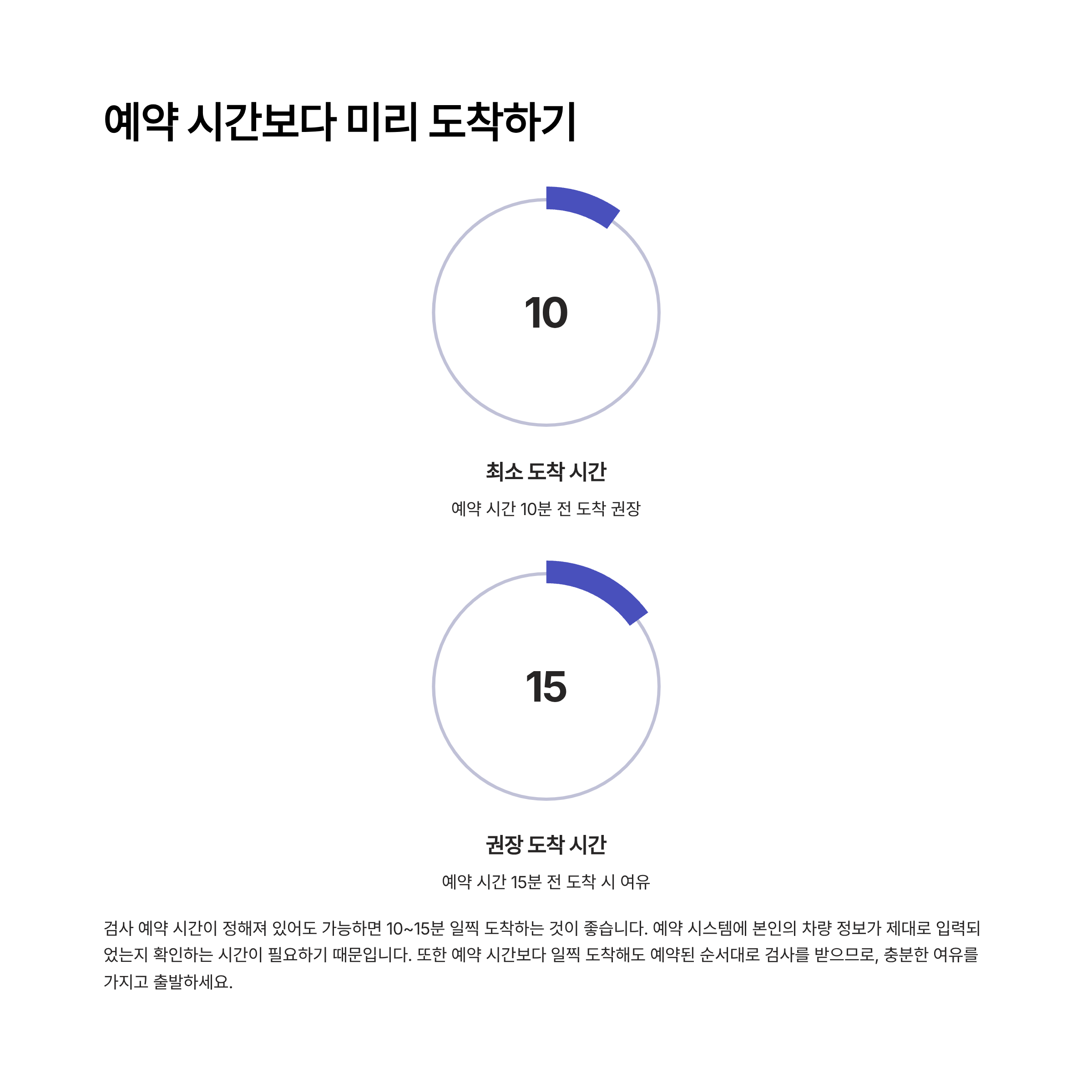 검사 예약 시간이 정해져 있어도 가능하면 10~15분 일찍 도착하는 것이 좋습니다. 예약 시스템에 본인의 차량 정보가 제대로 입력되었는지 확인하는 시간이 필요하기 때문입니다. 또한 예약 시간보다 일찍 도착해도 예약된 순서대로 검사를 받으므로, 충분한 여유를 가지고 출발하세요.