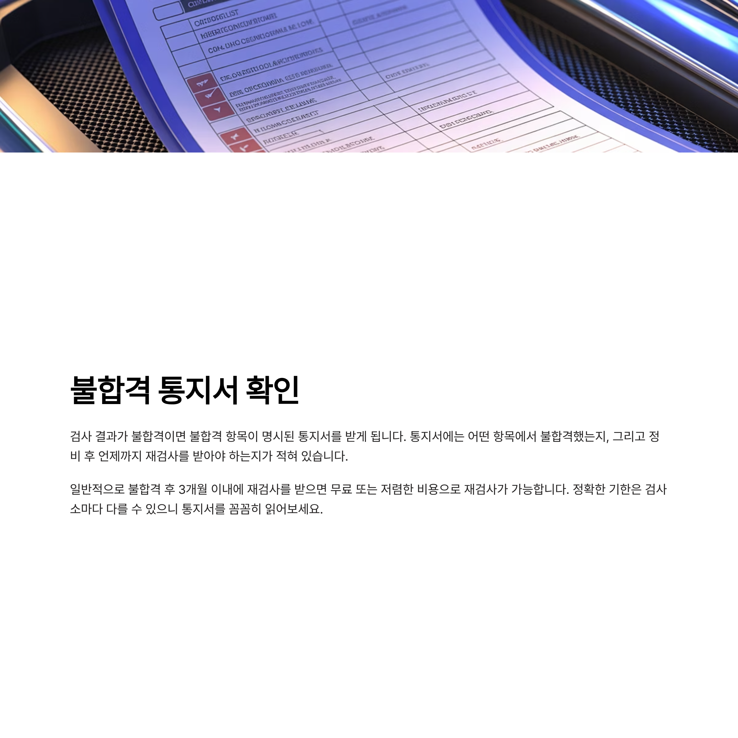 검사 결과가 불합격이면 불합격 항목이 명시된 통지서를 받게 됩니다. 통지서에는 어떤 항목에서 불합격했는지, 그리고 정비 후 언제까지 재검사를 받아야 하는지가 적혀 있습니다. 일반적으로 불합격 후 3개월 이내에 재검사를 받으면 무료 또는 저렴한 비용으로 재검사가 가능합니다. 정확한 기한은 검사소마다 다를 수 있으니 통지서를 꼼꼼히 읽어보세요.
