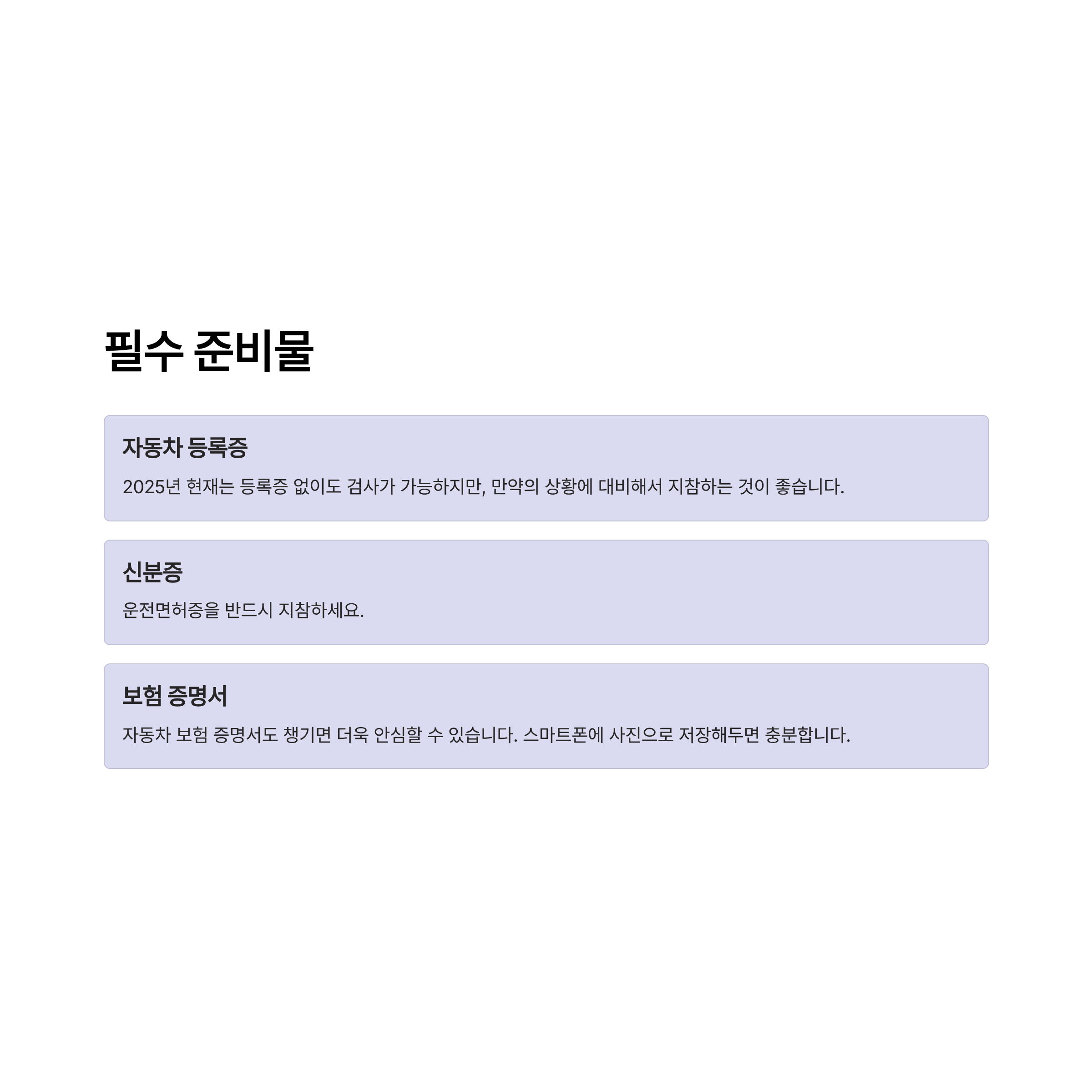 자동차검사를 받을 때는 몇 가지 필수 준비물이 있습니다. 가장 중요한 것은 자동차 등록증입니다. 과거와 달리 2025년 현재는 자동차 등록증 없이도 검사가 가능하지만, 만약의 상황에 대비해서 지참하는 것이 좋습니다. 신분증(운전면허증)도 필요하며, 자동차 보험 증명서도 챙기면 더욱 안심할 수 있습니다. 다만 보험 증명서는 전산으로 조회되는 경우가 많으므로, 스마트폰에 사진으로 저장해두면 충분합니다.