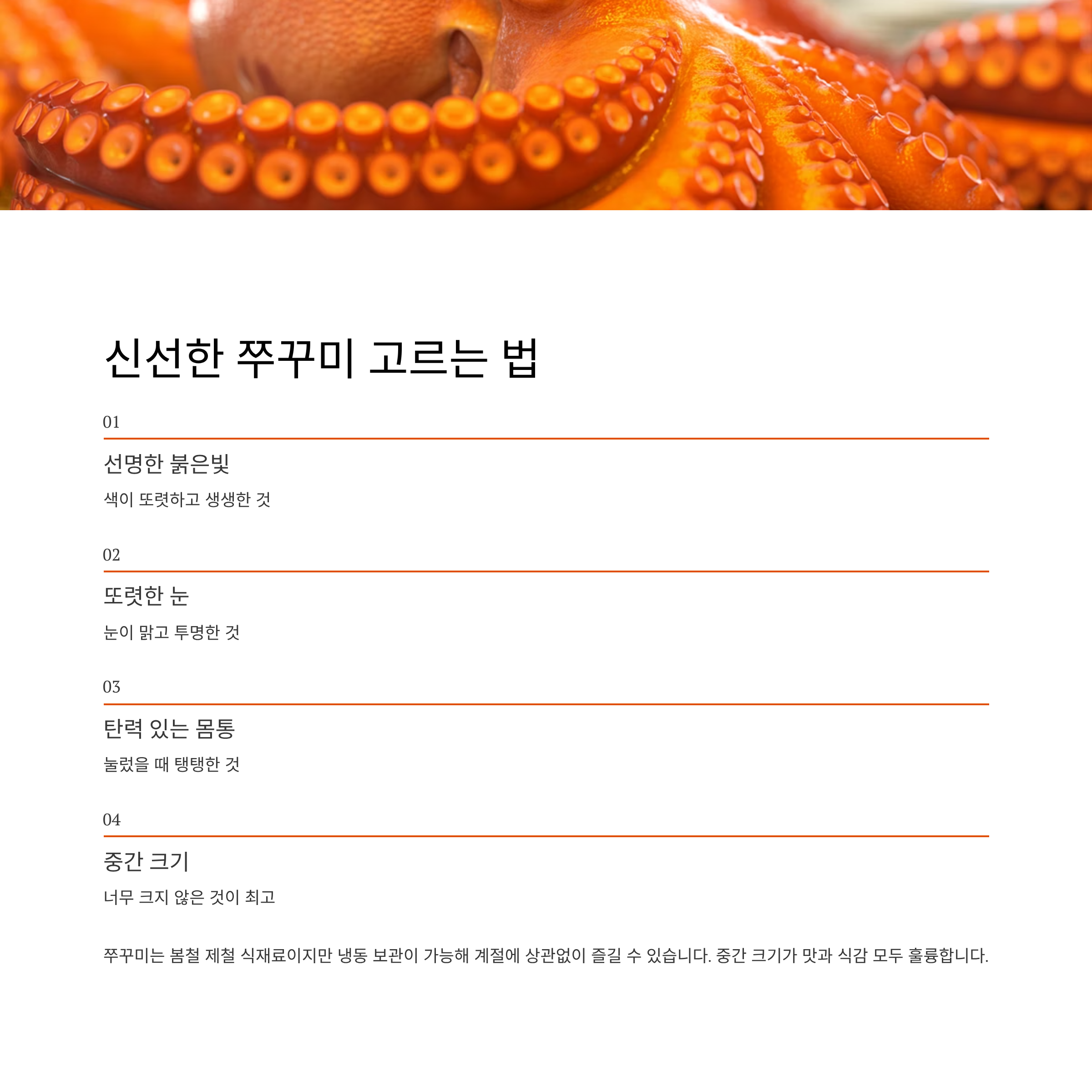 싱싱한 생쭈꾸미를 고를 때는 선명한 붉은빛을 띠고 눈이 또렷하며 탄력 있는 것을 선택하세요.