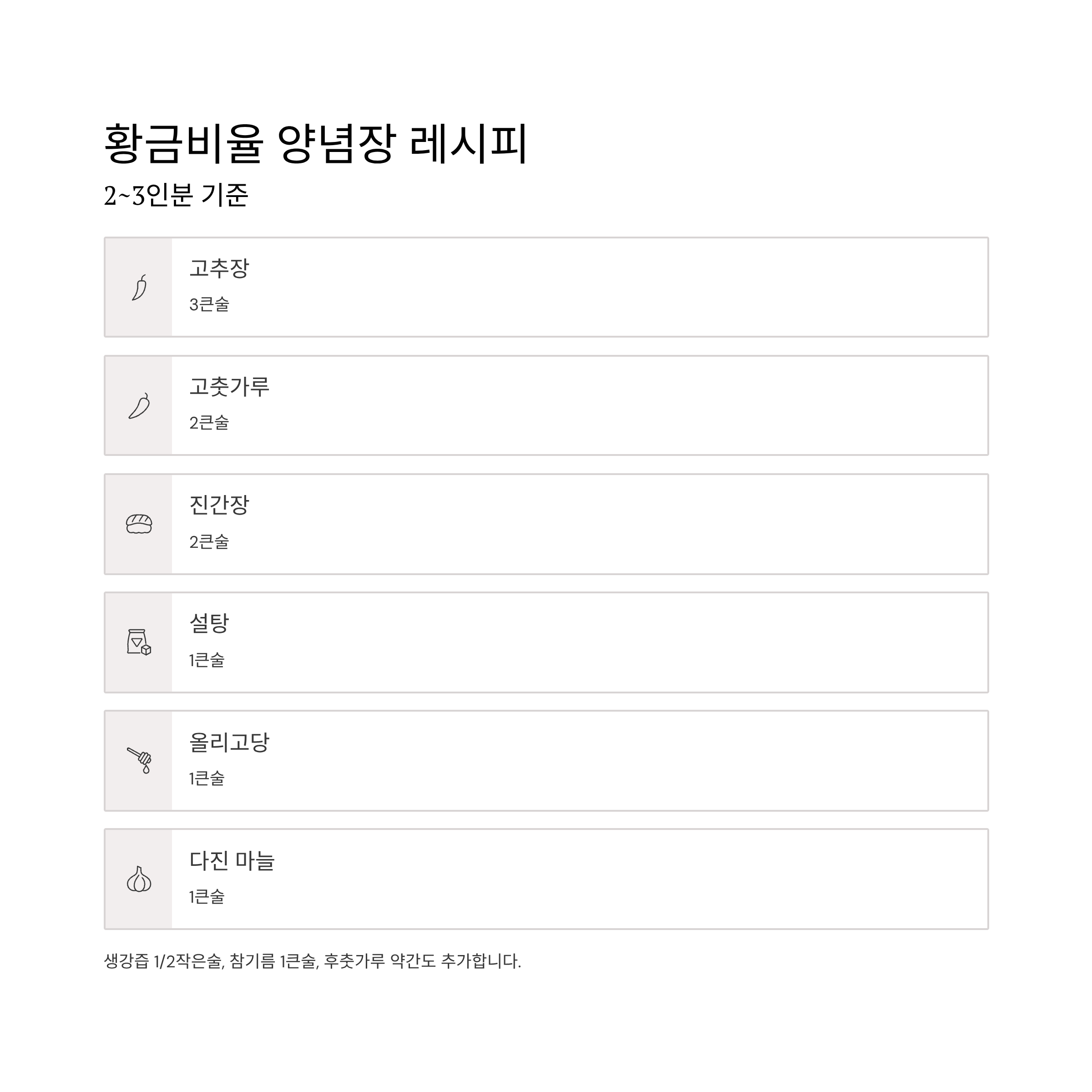 고추장 3큰술, 고춧가루 2큰술, 진간장 2큰술, 설탕 1큰술, 올리고당 1큰술, 다진 마늘 1큰술, 생강즙 1/2작은술, 참기름 1큰술, 후춧가루 약간