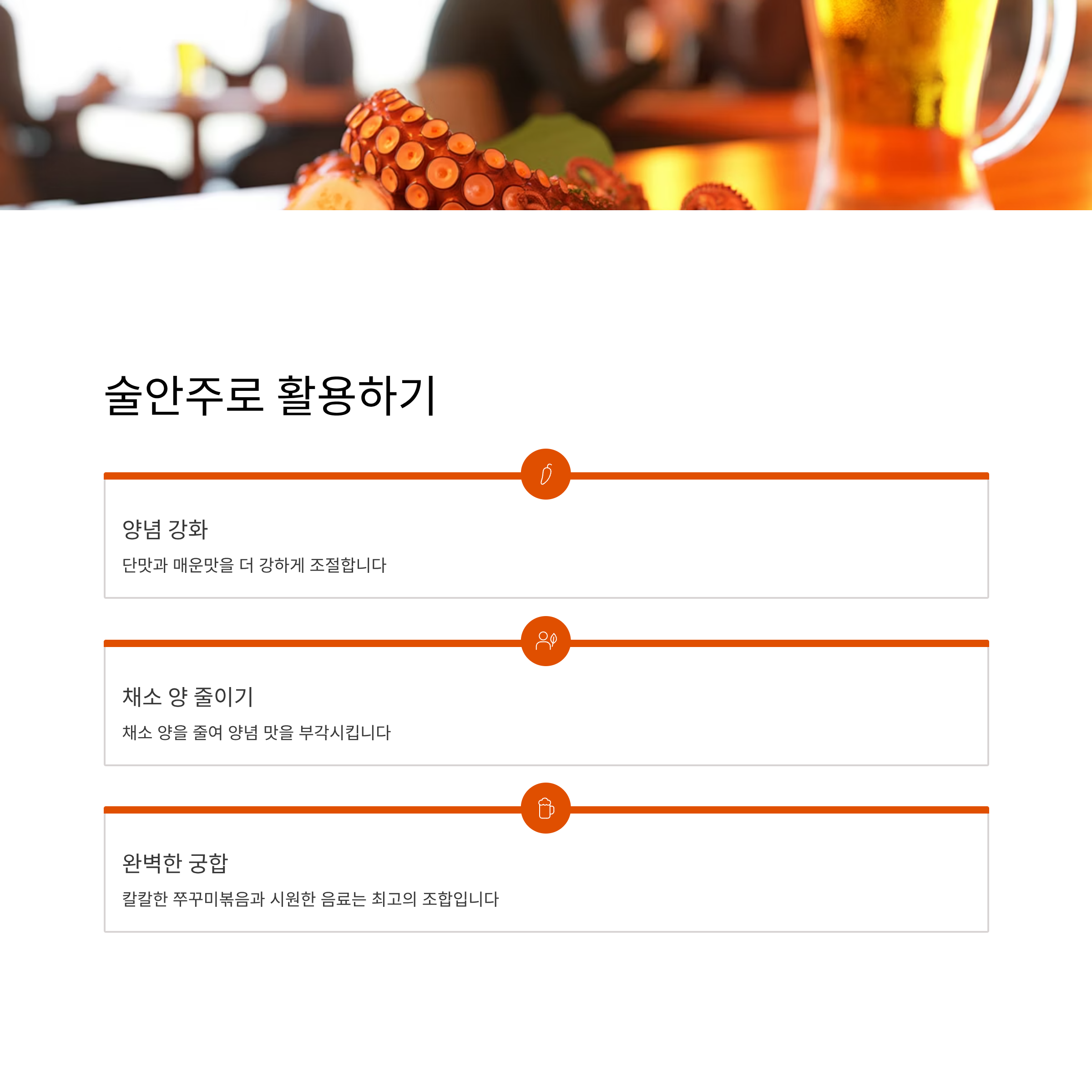 술안주로 즐길 때는 채소 양을 줄이고 양념의 단맛과 매운맛을 더 강하게 조절합니다.