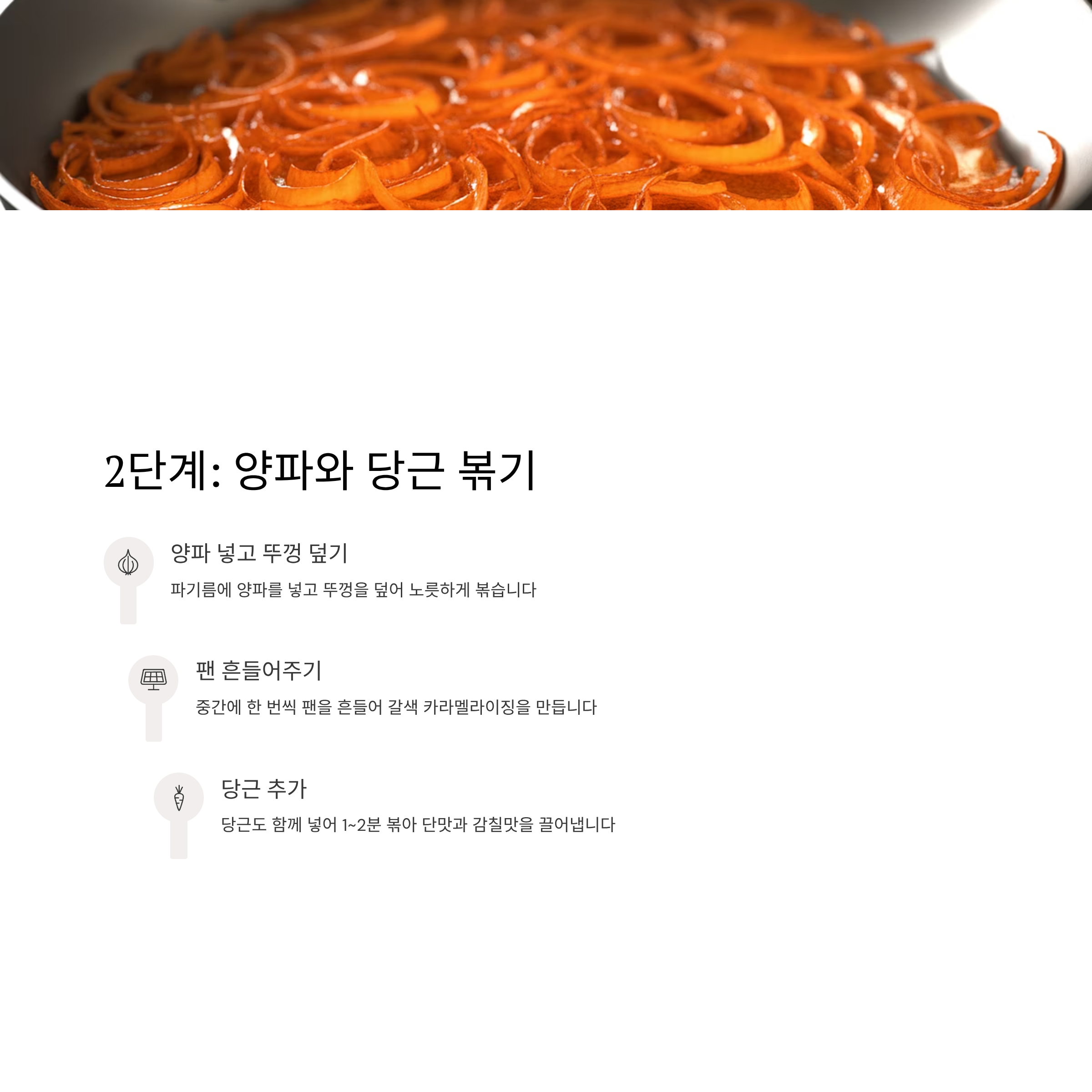 중간에 한 번씩 팬을 흔들어주면 갈색 카라멜라이징이 생겨 양파의 단맛과 감칠맛이 업됩니다.