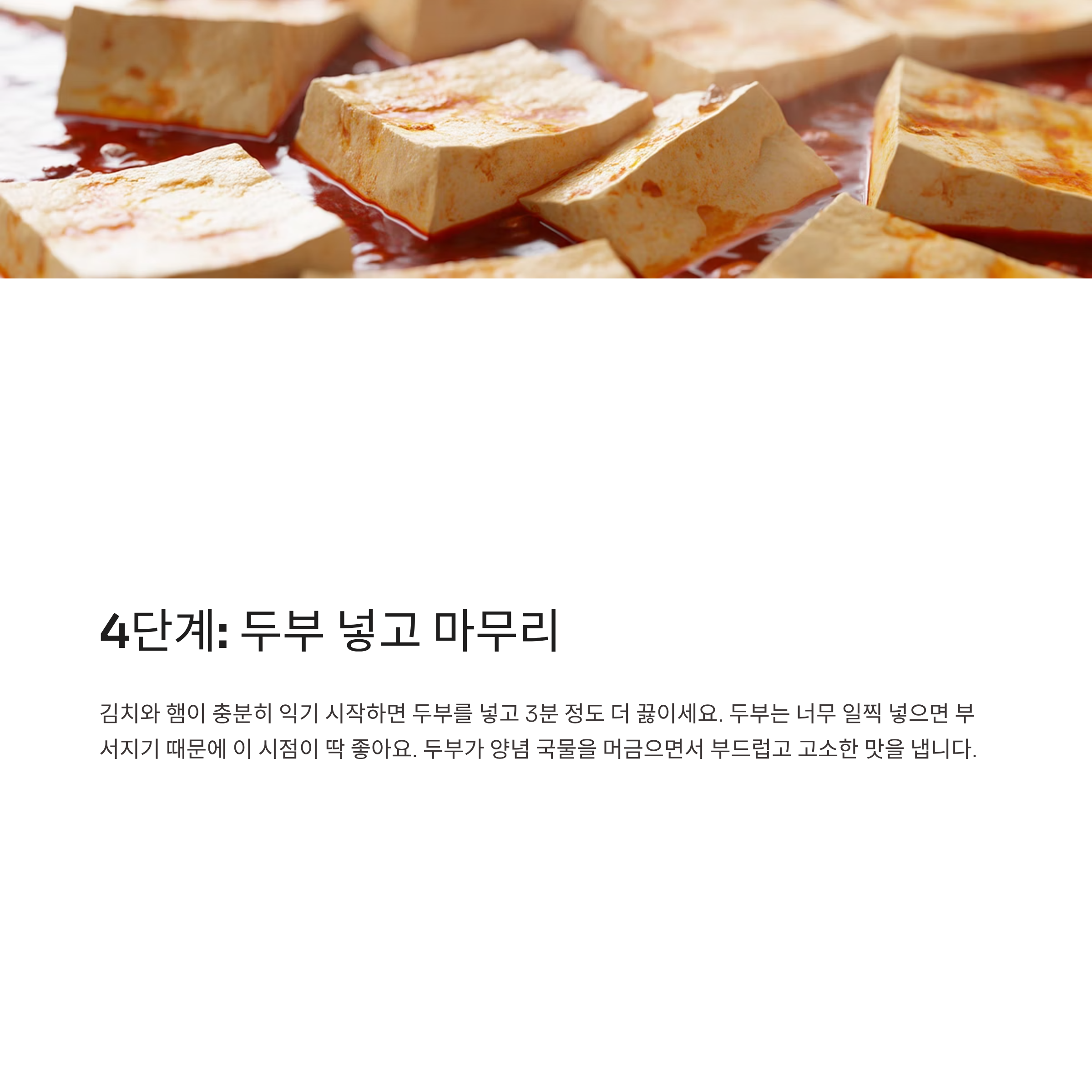 | 6단계 | 두부 넣기 | 3분 | 너무 일찍 넣지 않기 |