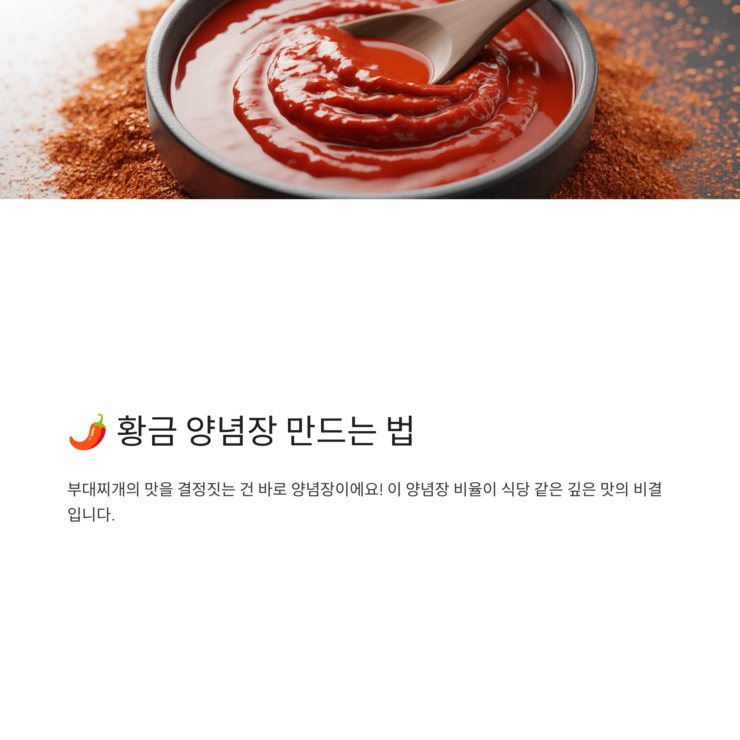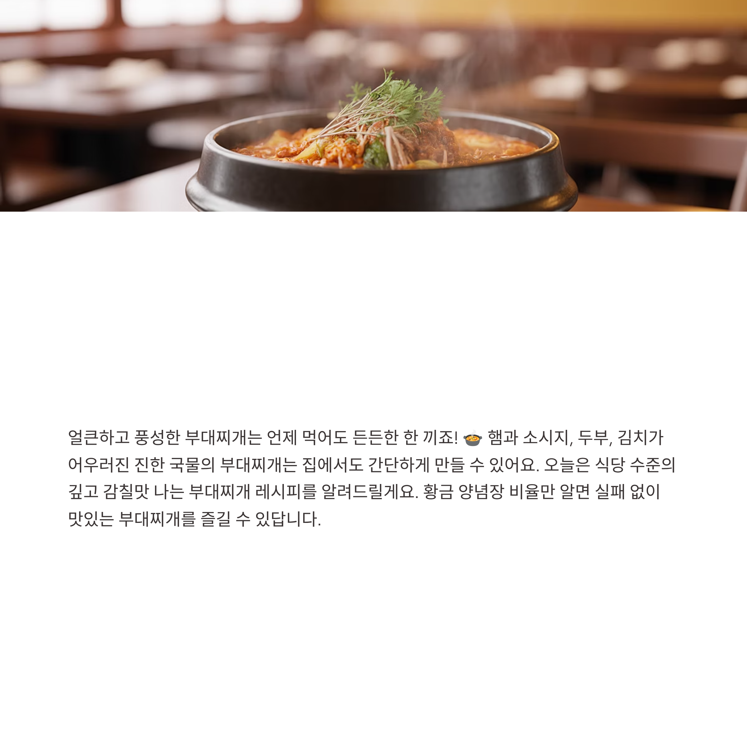 오늘은 식당 수준의 깊고 감칠맛 나는 부대찌개 레시피를 알려드릴게요. 황금 양념장 비율만 알면 실패 없이 맛있는 부대찌개를 즐길 수 있답니다.