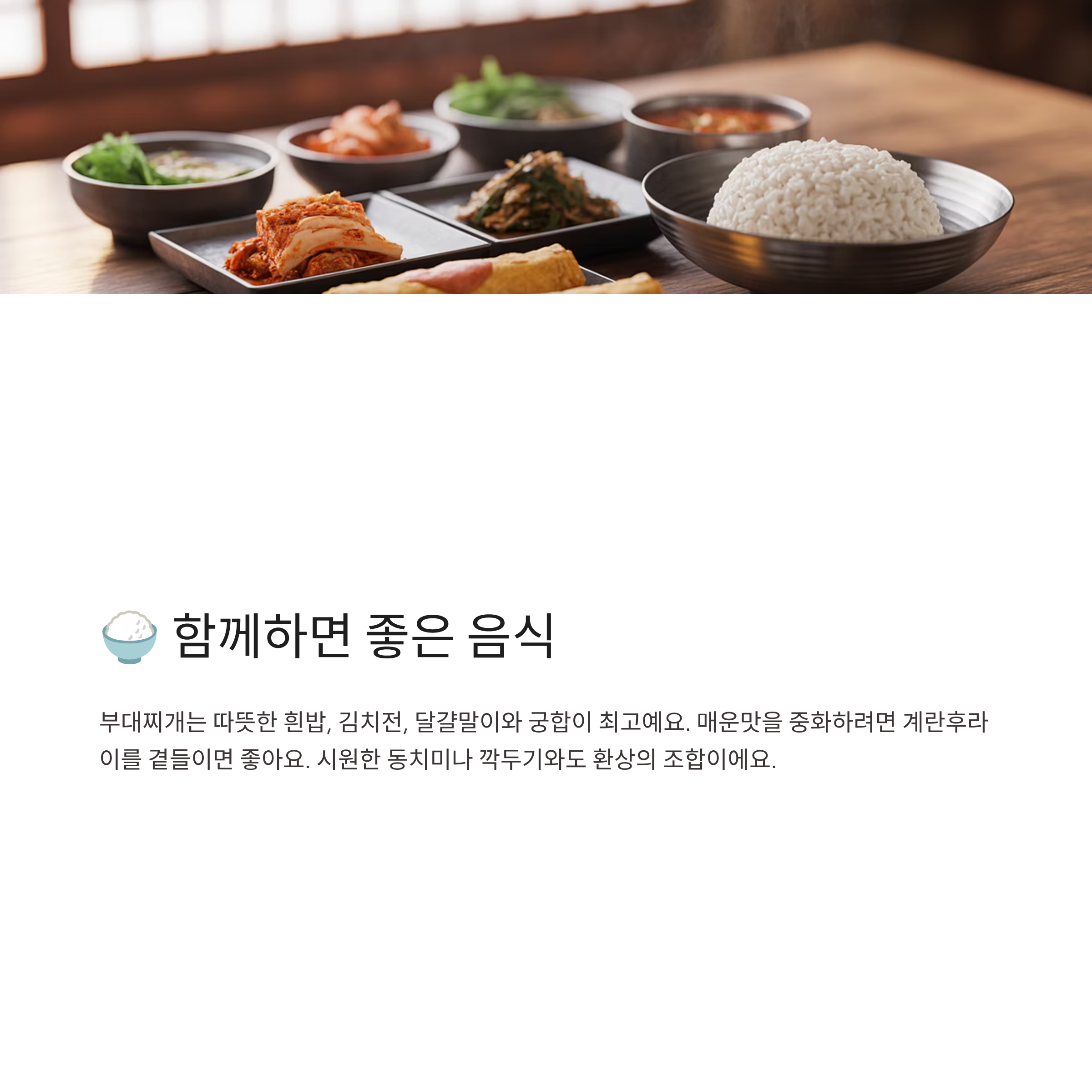 부대찌개는 따뜻한 흰밥, 김치전, 달걀말이와 궁합이 최고예요.
