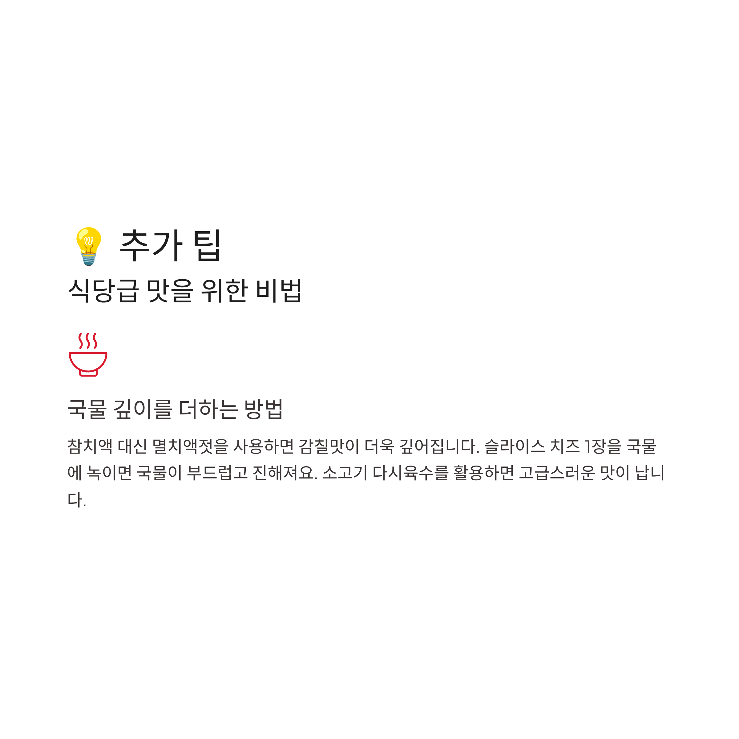 물 대신 멸치육수나 소고기 다시육수를 사용하면 국물 맛이 훨씬 깊어져요.