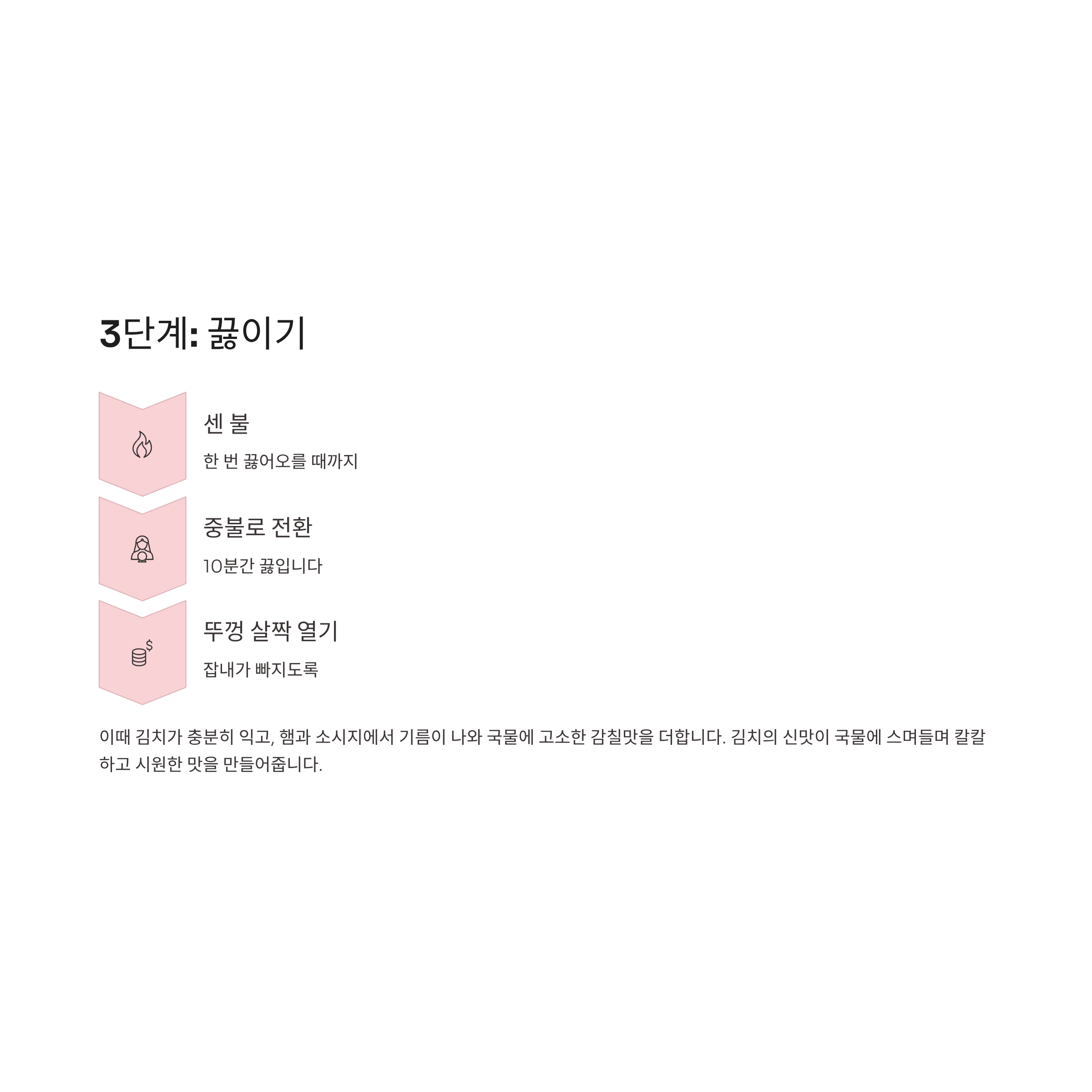 | 5단계 | 중불에서 끓이기 | 10분 | 김치 향이 우러나올 때까지 |
