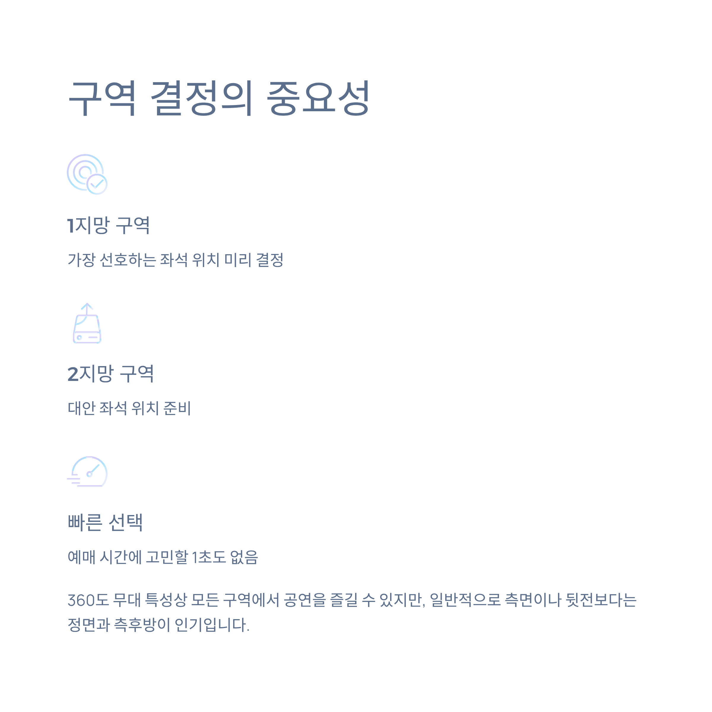 좋은 좌석을 빠르게 선택하려면 미리 1지망과 2지망 구역을 정해두는 것이 매우 중요합니다.
