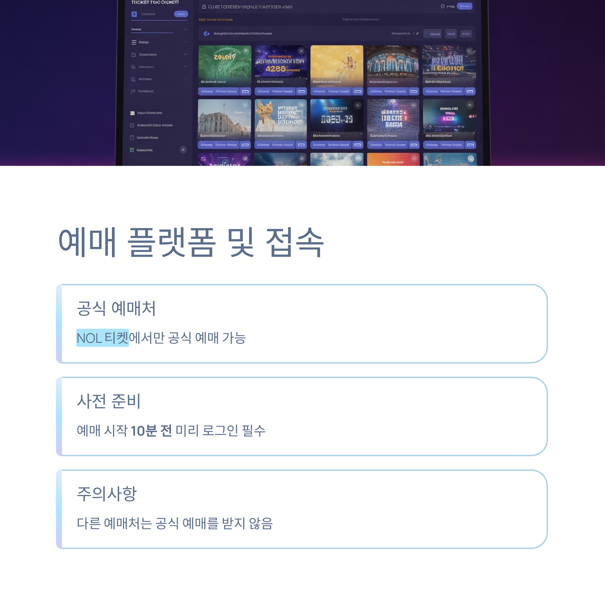 공식 예매처는 NOL 티켓입니다. 다른 예매처에서는 공식적으로 예매를 받지 않으므로, 반드시 NOL 티켓에서만 예매를 진행해야 합니다.