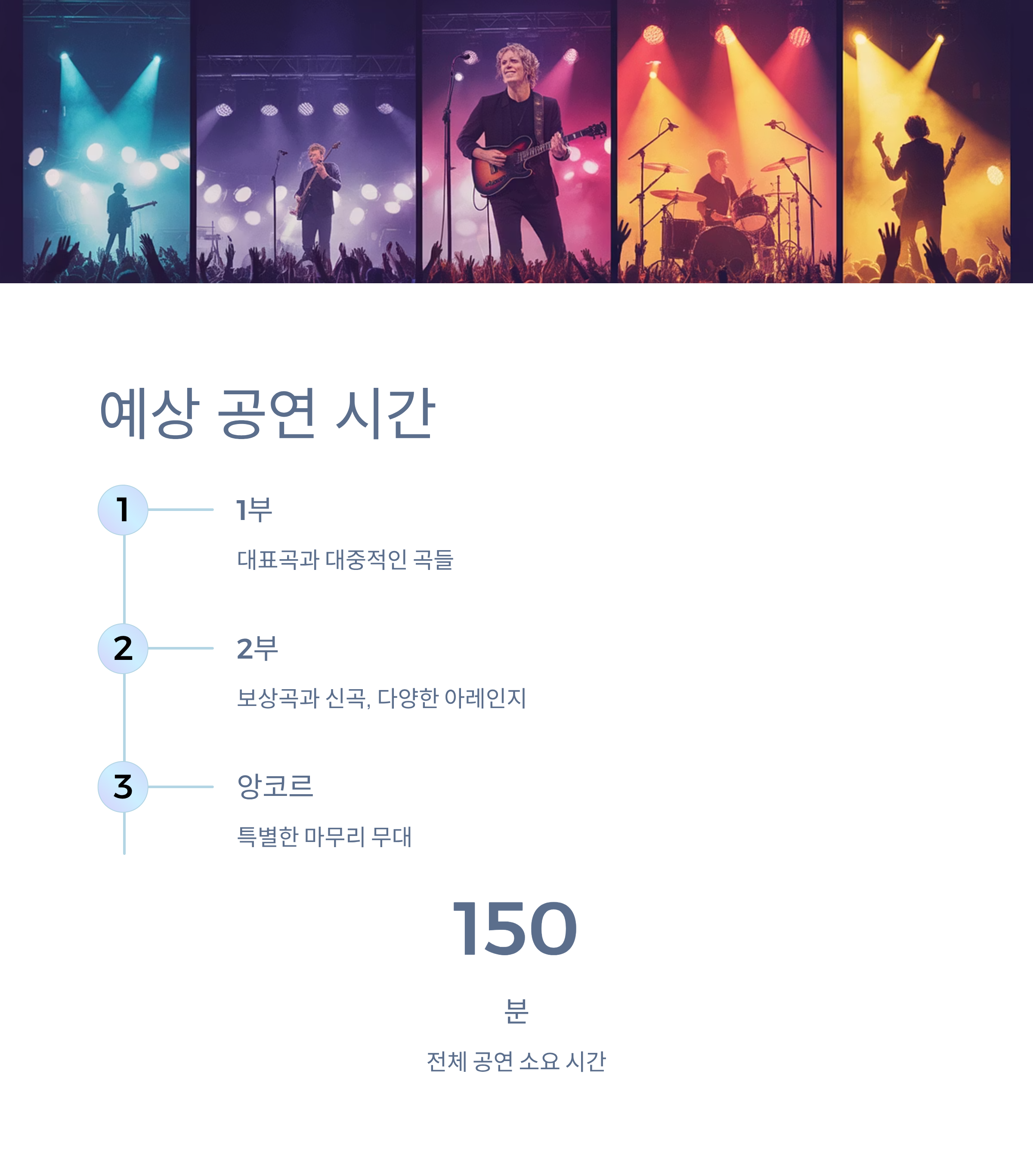 앙코르 무대가 있을 경우 약 15분 추가되므로 약 8시 45분경이 될 수 있습니다.