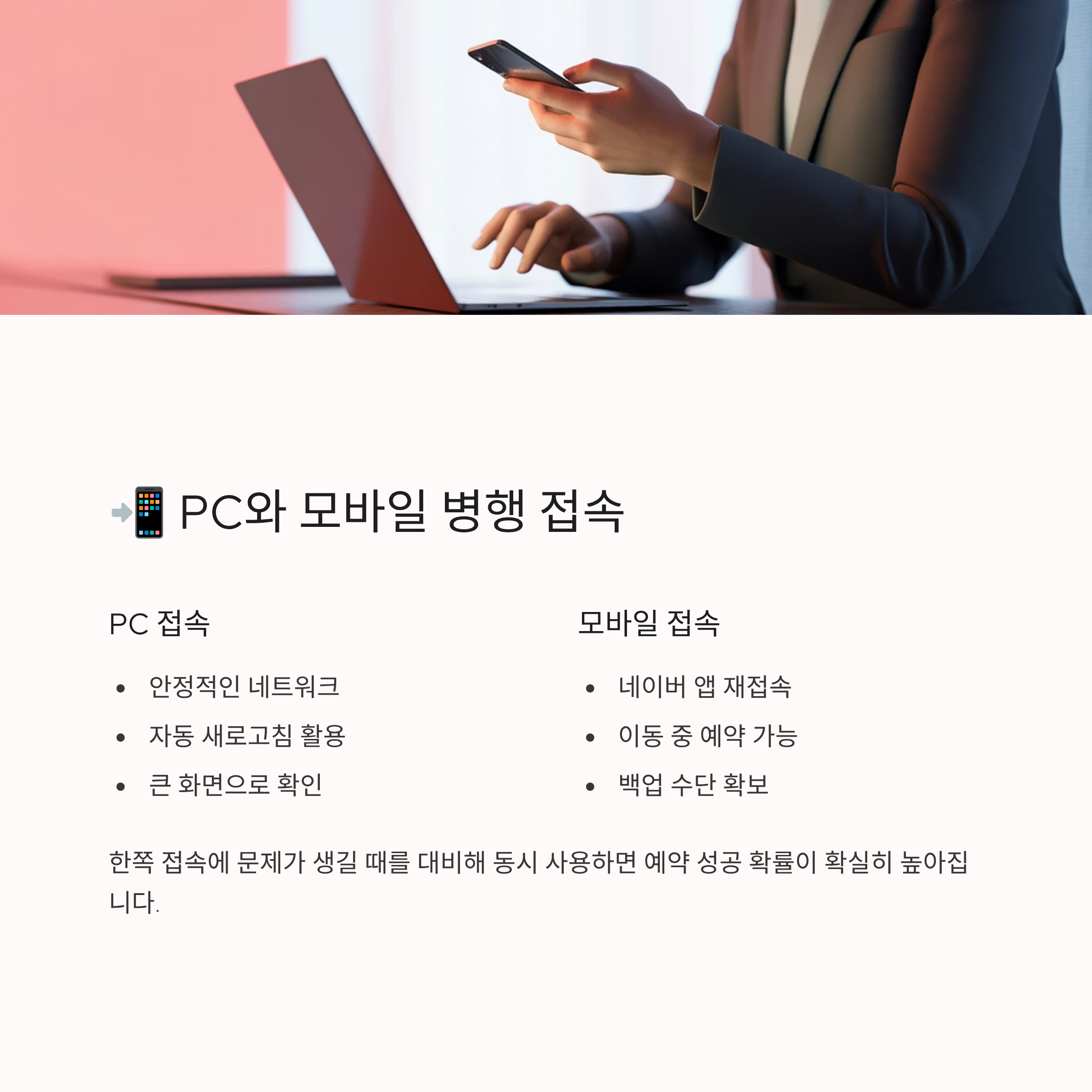 한쪽 접속에 문제가 생길 때를 대비해 PC와 모바일 기기를 동시에 사용하면 예약 성공 확률이 확실히 높아집니다. 특히 자동 새로고침과 네이버 앱 재접속을 병행하면 안정적으로 예약 과정에 참여할 수 있습니다.