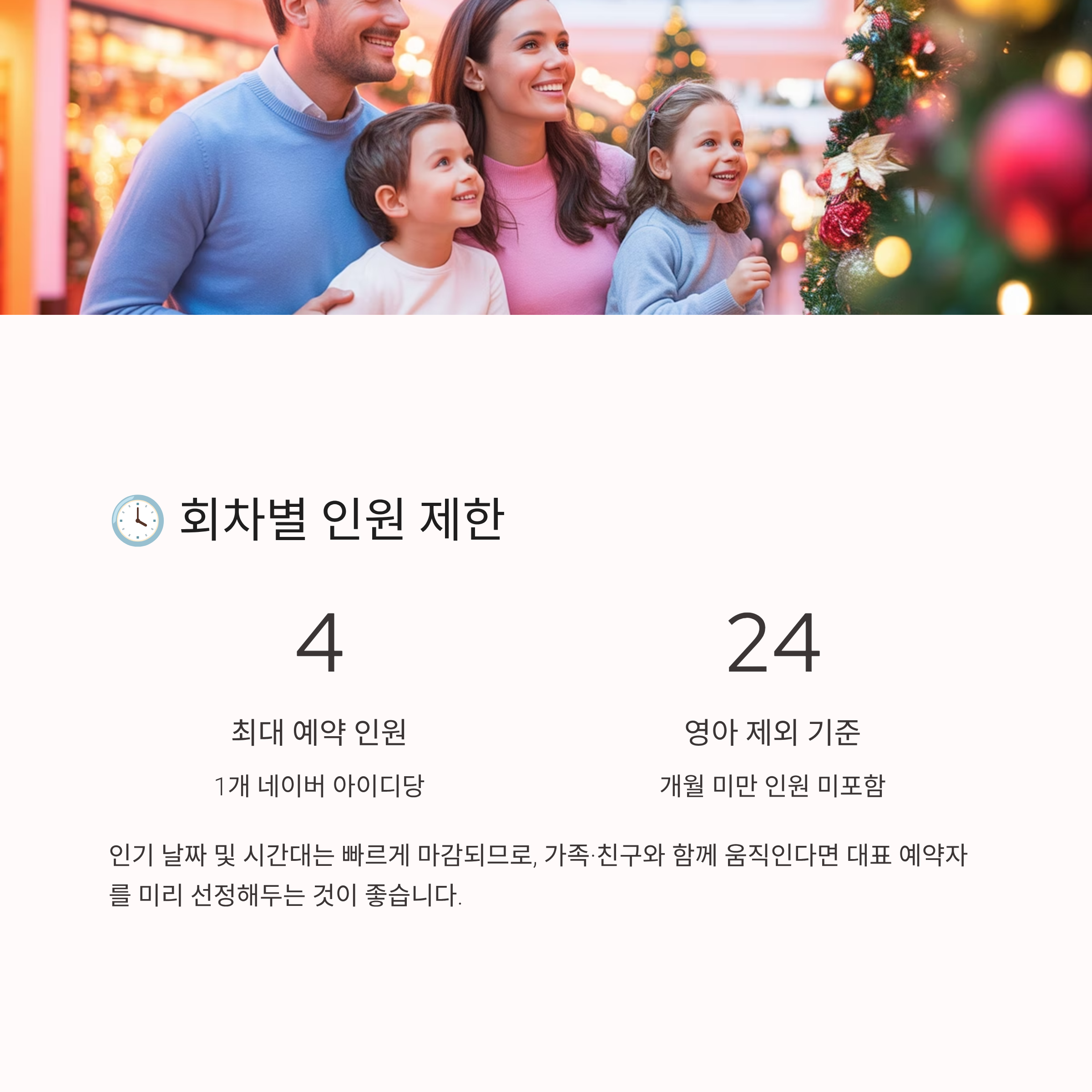 1개 네이버 아이디로 최대 4인까지 예약할 수 있으며, 24개월 미만 영아는 인원수에서 제외됩니다. 1회 예약 당 최대 인원이 제한되어 있어 인기 날짜 및 시간대는 빠르게 마감되므로, 가족·친구와 함께 움직인다면 대표 예약자를 미리 선정해두는 것이 좋습니다.