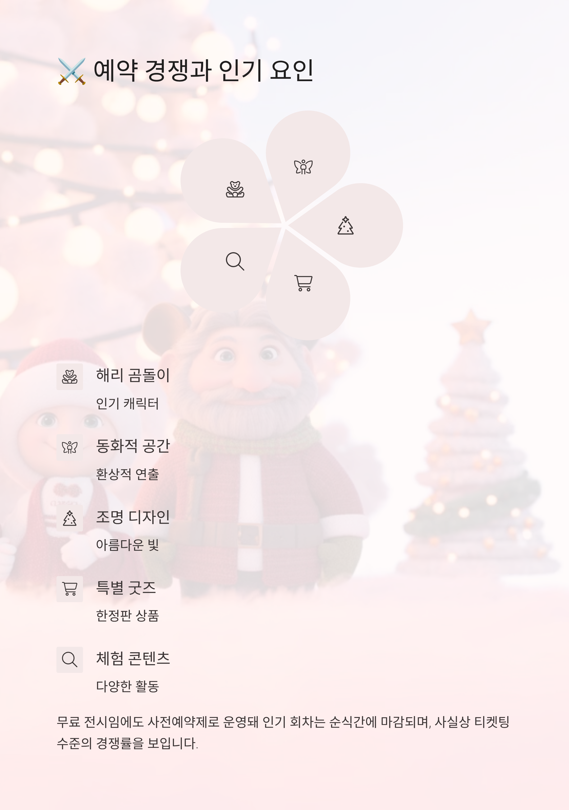 크리스마스 분위기 가득한 환상적인 공간에서의 추억을 위해 미리 예약하는 것은 필수입니다. 특히 이번 3차 예약은 회차별 인원이 나뉘어 있어, 철저한 준비와 전략이 없으면 원하는 시간대를 잡기 어렵습니다.