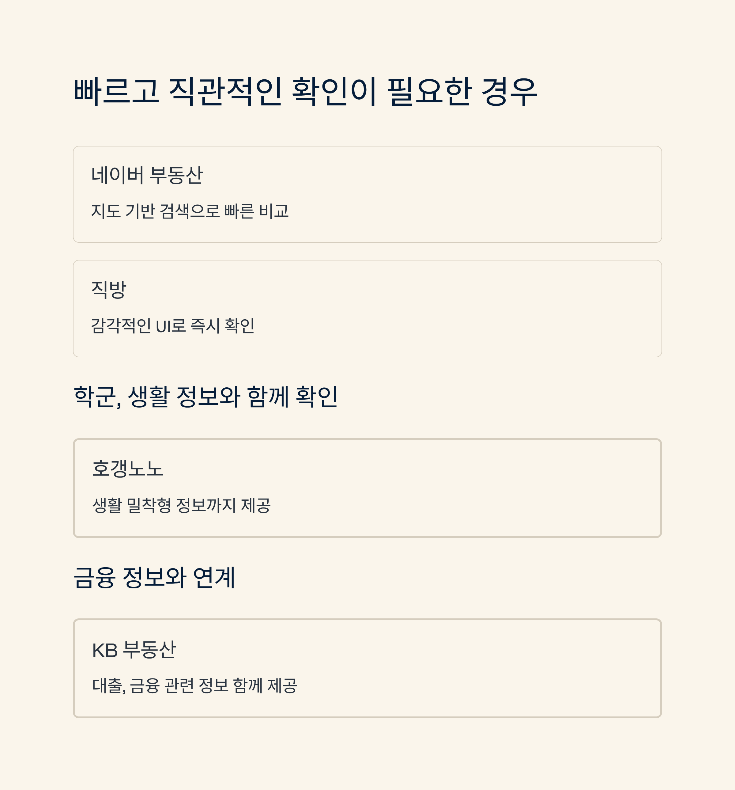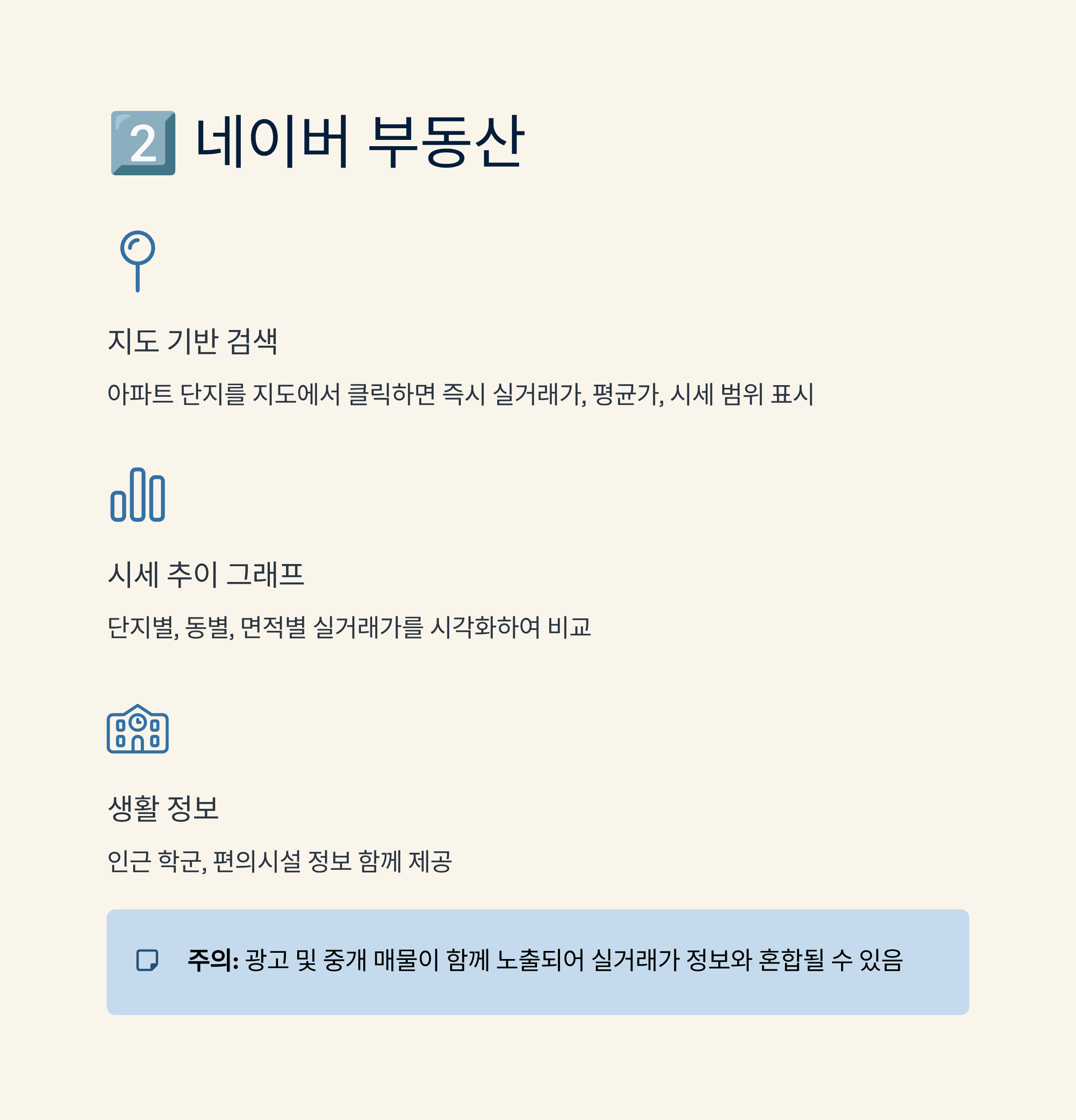 - 광고 및 중개 매물이 함께 노출되어 실거래가 정보와 혼합될 수 있음
