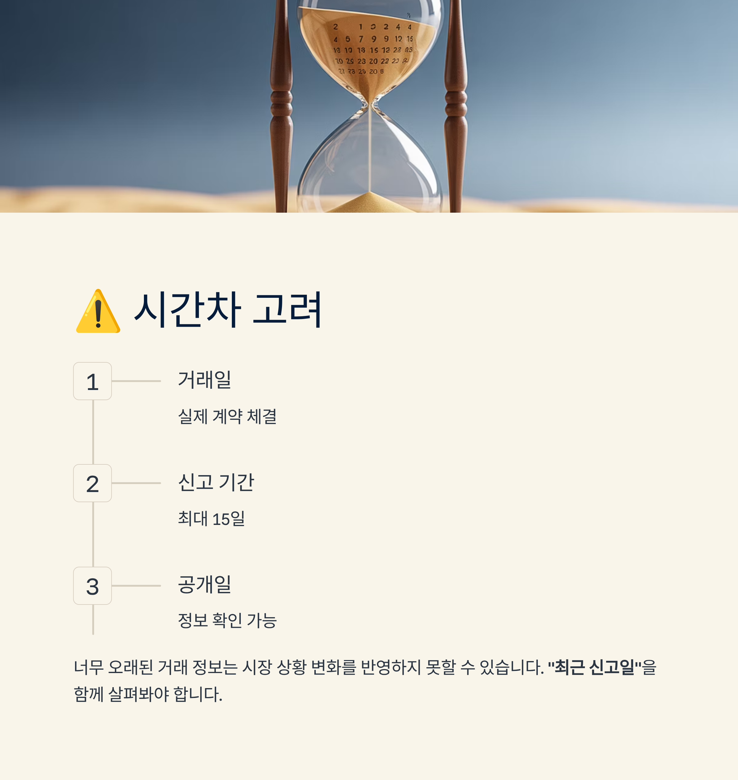 공개 시점이 15일로 단축되었지만, 여전히 거래일과 공개일 사이에 차이가 있습니다. 따라서 실거래가를 확인할 때는 "최근 신고일"을 함께 살펴봐야 합니다. 너무 오래된 거래 정보는 시장 상황 변화를 반영하지 못할 수 있습니다.