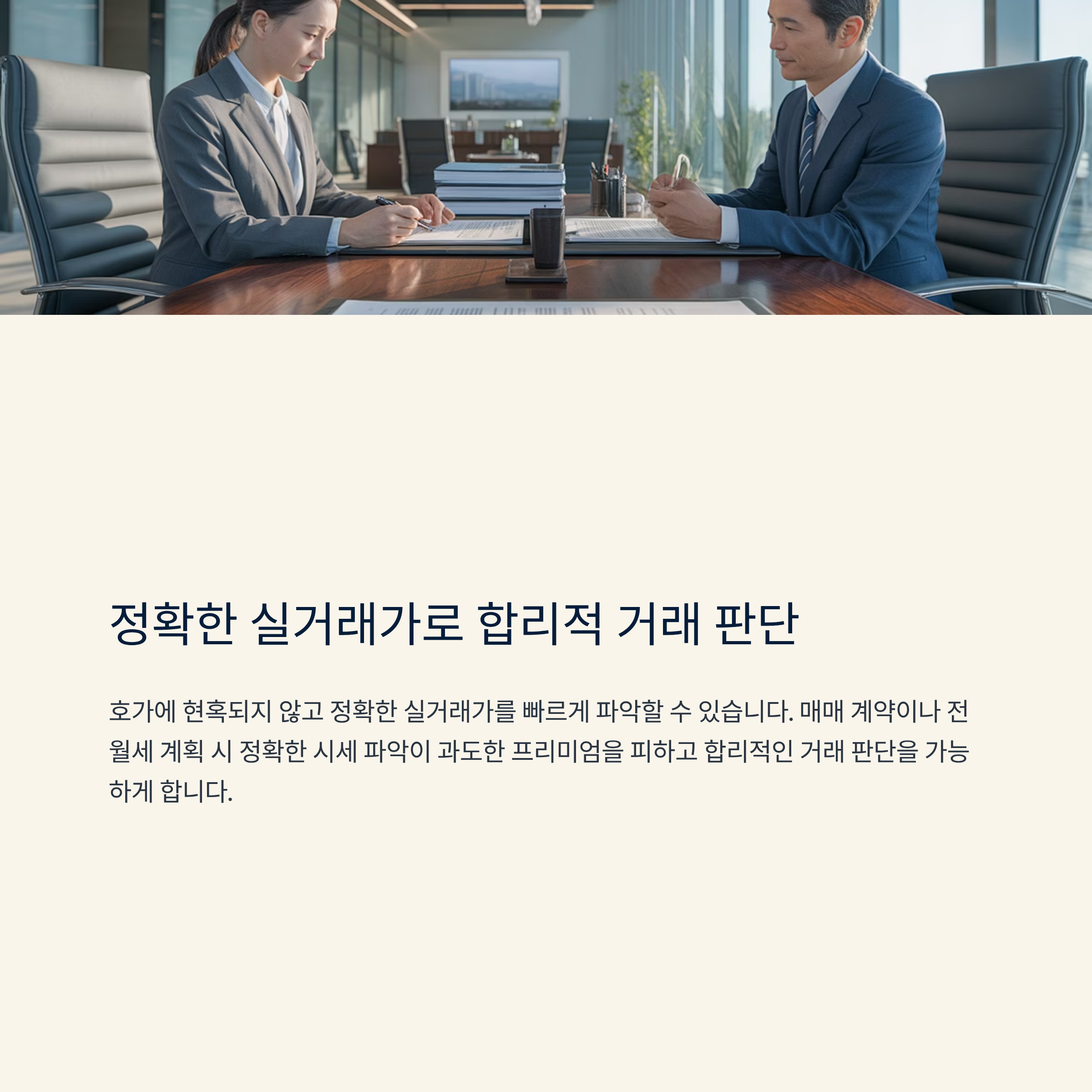 특히 매매 계약이나 전월세 계획을 세울 때, 정확한 시세 파악이 과도한 프리미엄을 피하고 합리적인 거래 판단을 가능하게 합니다.