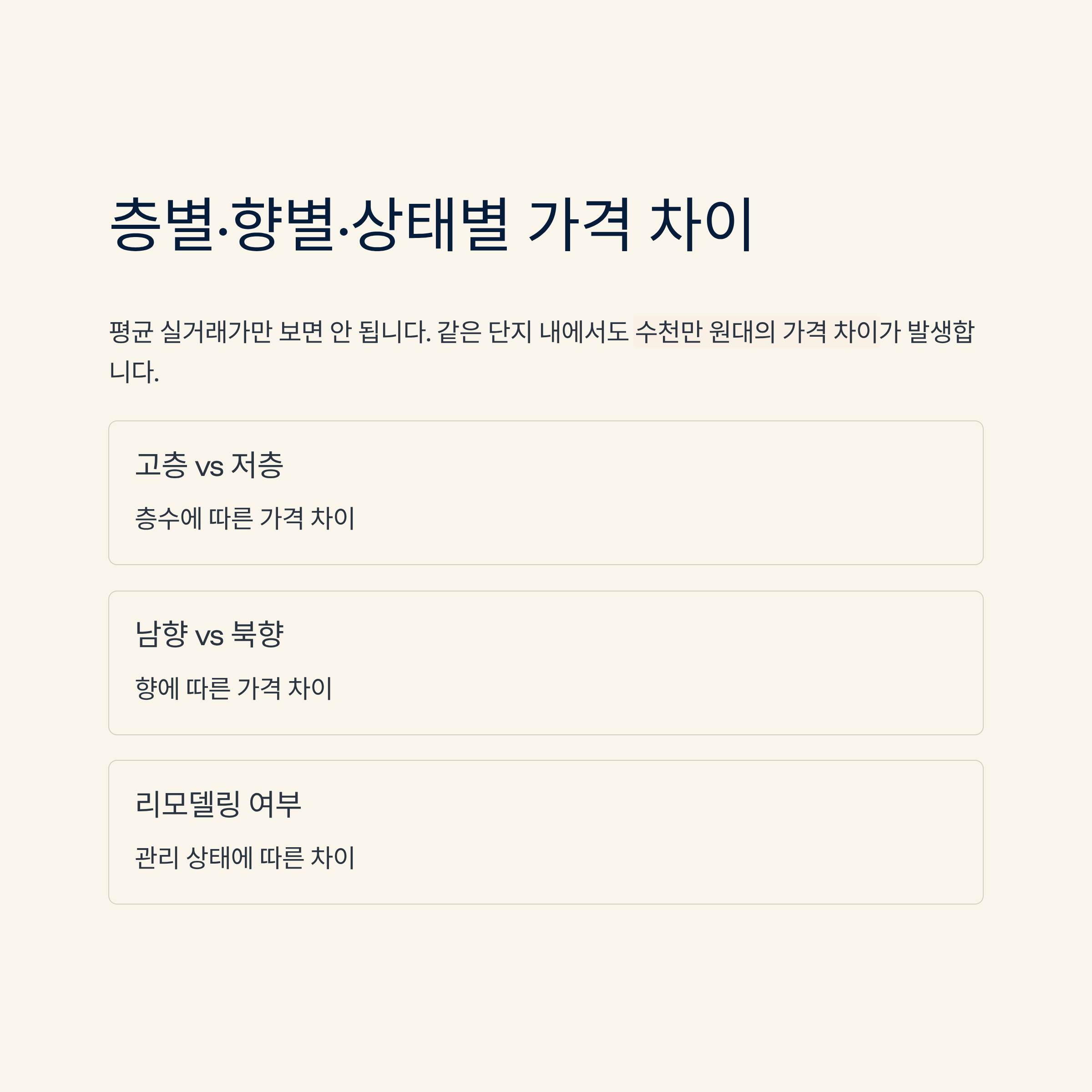 이러한 요소들로 인해 같은 면적이라도 수천만 원대의 가격 차이가 발생합니다.