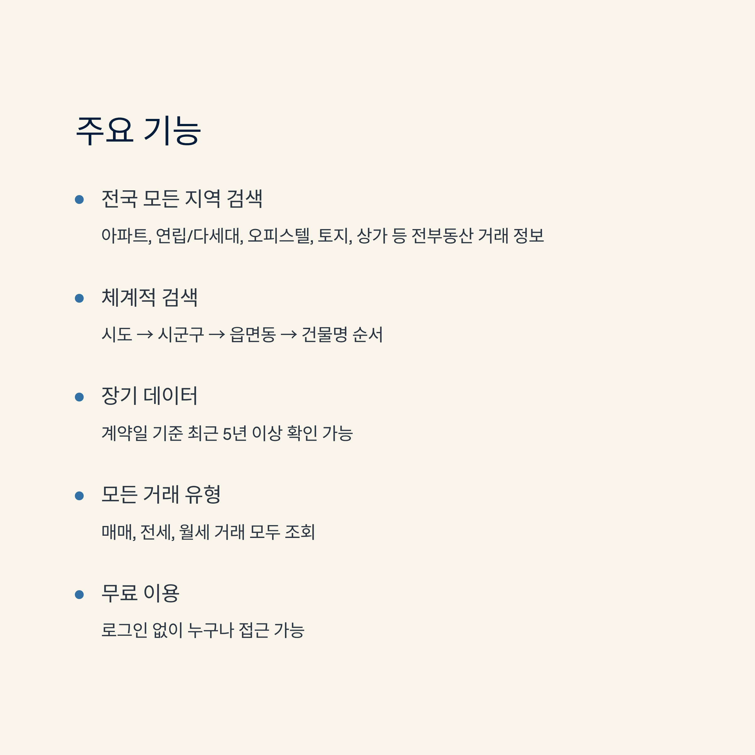 - 전국 모든 지역의 아파트, 연립/다세대, 오피스텔, 토지, 상가 등 전부동산 거래 정보 검색