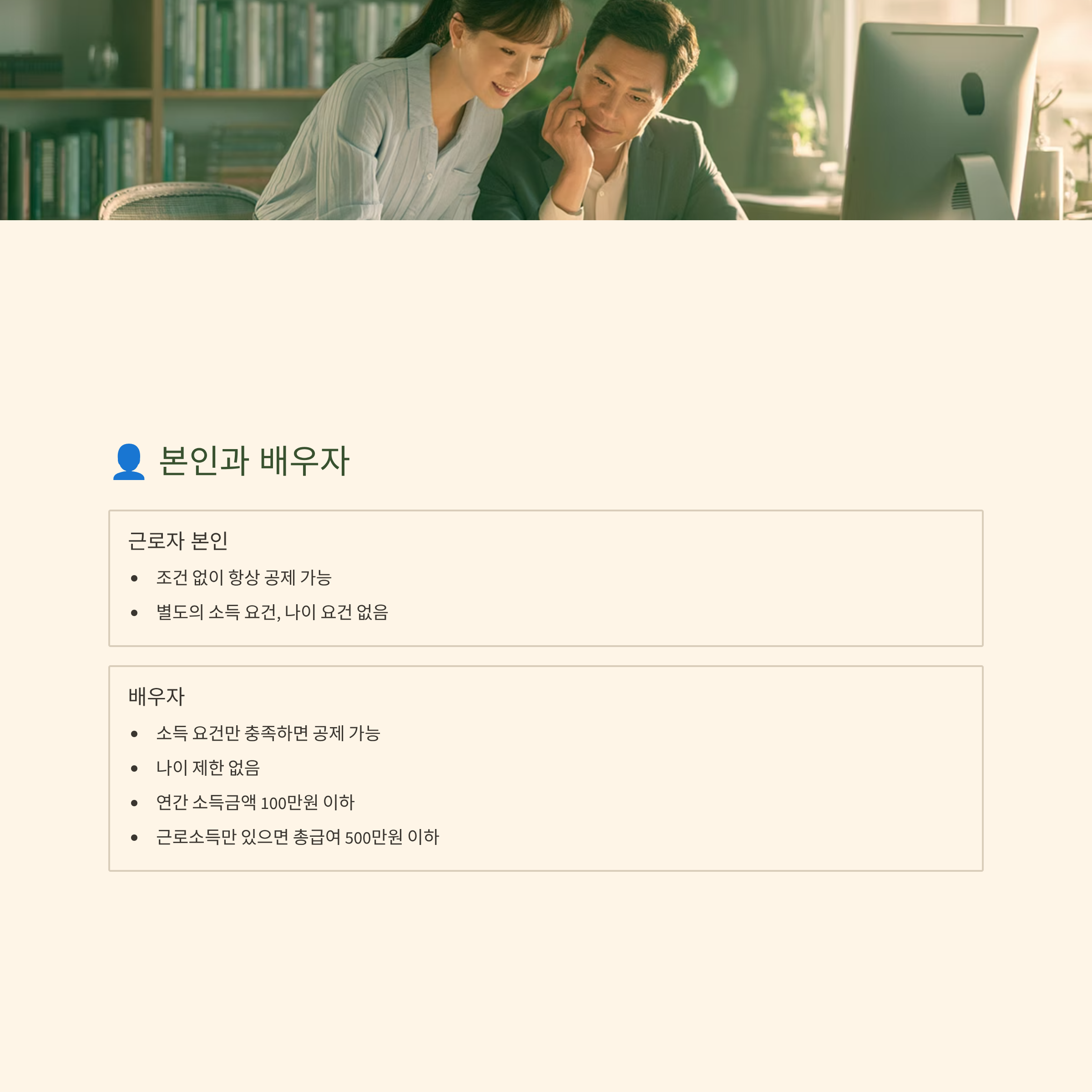 소득 기준: 연간 소득금액 100만원 이하 (근로소득만 있으면 총급여 500만원 이하)
