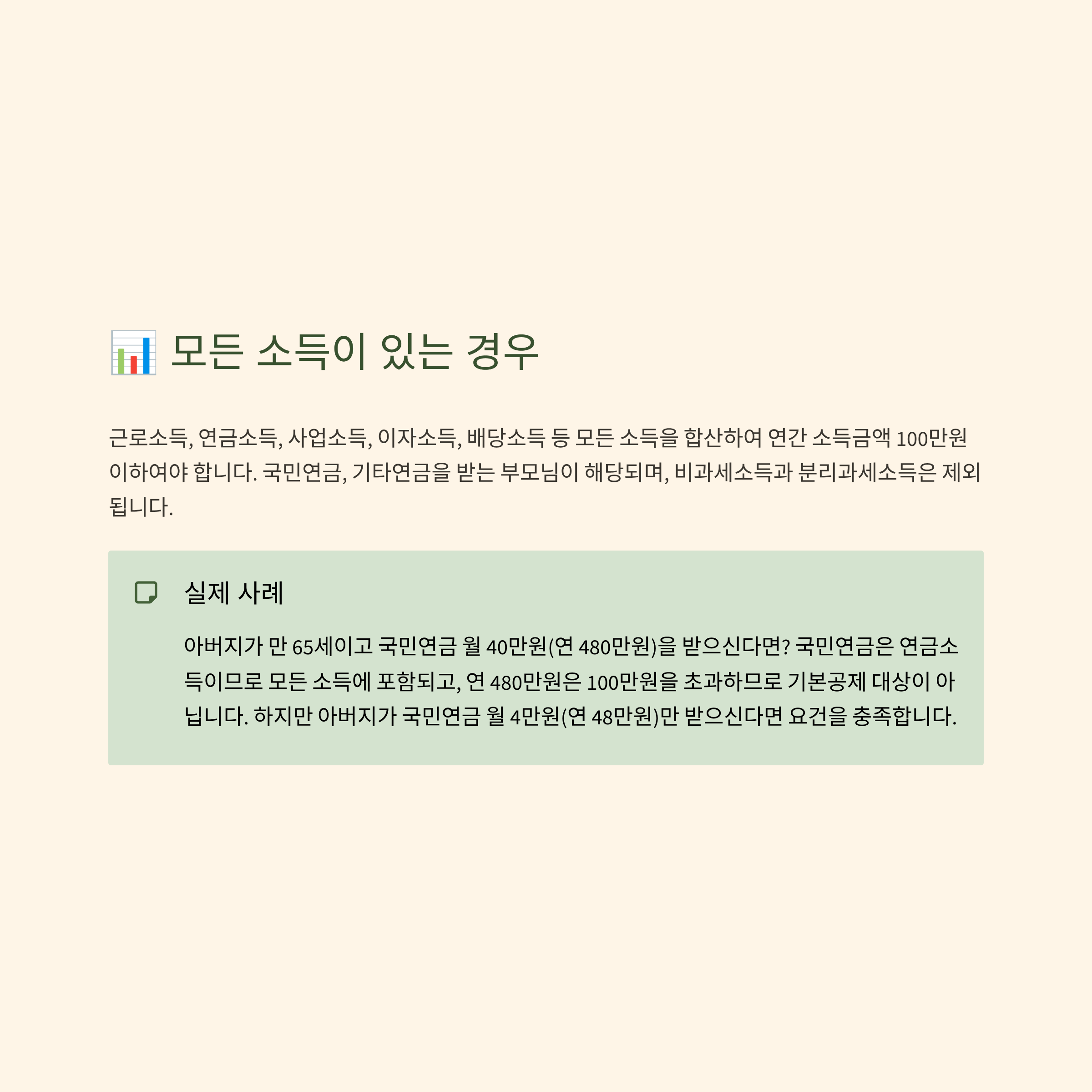 아버지가 만 65세이고 국민연금 월 40만원(연 480만원)을 받으신다면? 국민연금은 연금소득이므로 모든 소득에 포함되고, 연 480만원은 100만원을 초과하므로 기본공제 대상이 아닙니다.