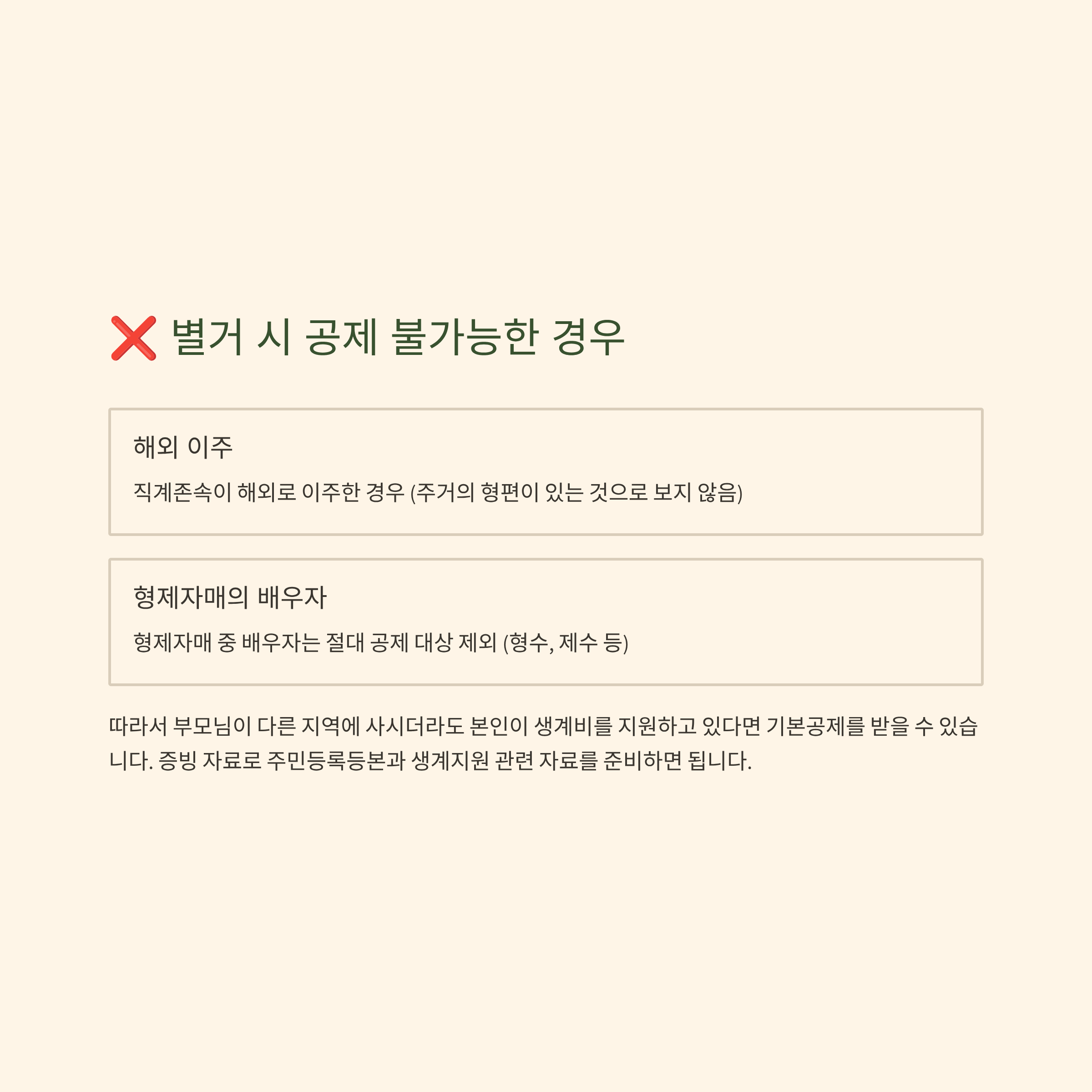 거주 요건: 동거하거나 주거 형편상 별거하는 경우 포함 (해외 이주는 제외)