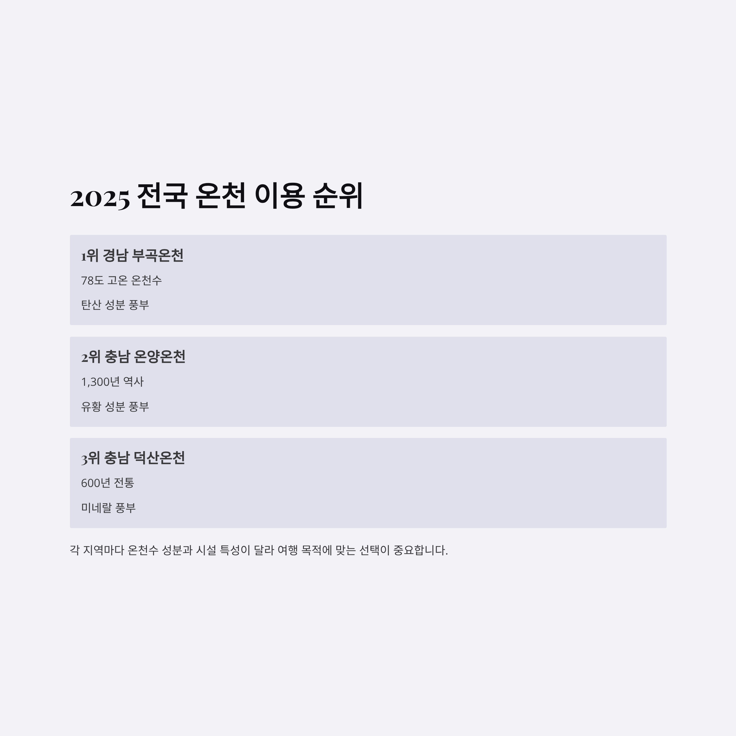 2025년 기준 전국 온천 이용 순위 1위는 경남 부곡온천, 2위는 충남 온양온천, 3위는 충남 덕산온천으로 나타났으며, 각 지역마다 온천수 성분과 시설 특성이 달라 여행 목적에 맞는 선택이 중요합니다.