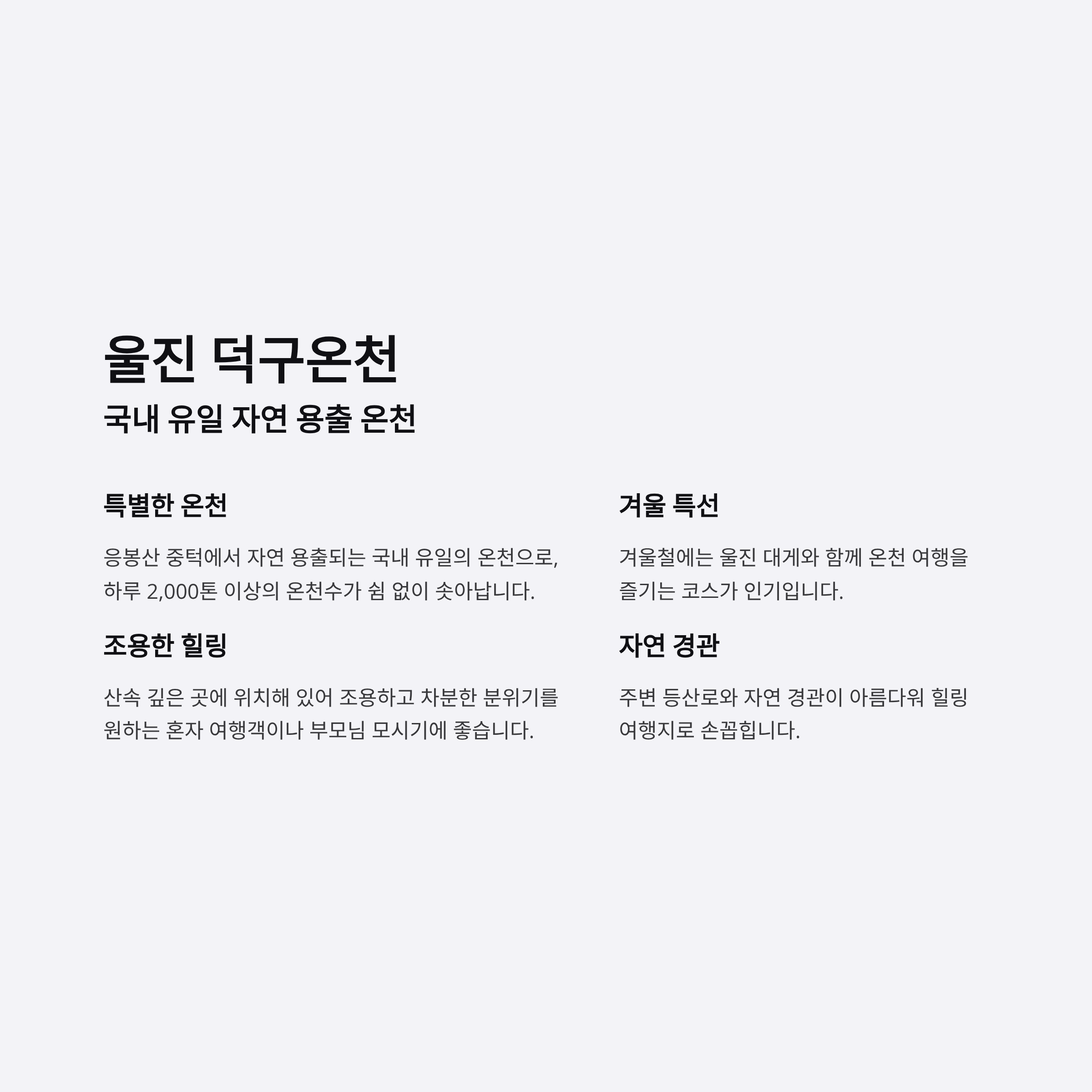 겨울철에는 울진 대게와 함께 온천 여행을 즐기는 코스가 인기이며, 주변 등산로와 자연 경관이 아름다워 힐링 여행지로 손꼽힙니다.