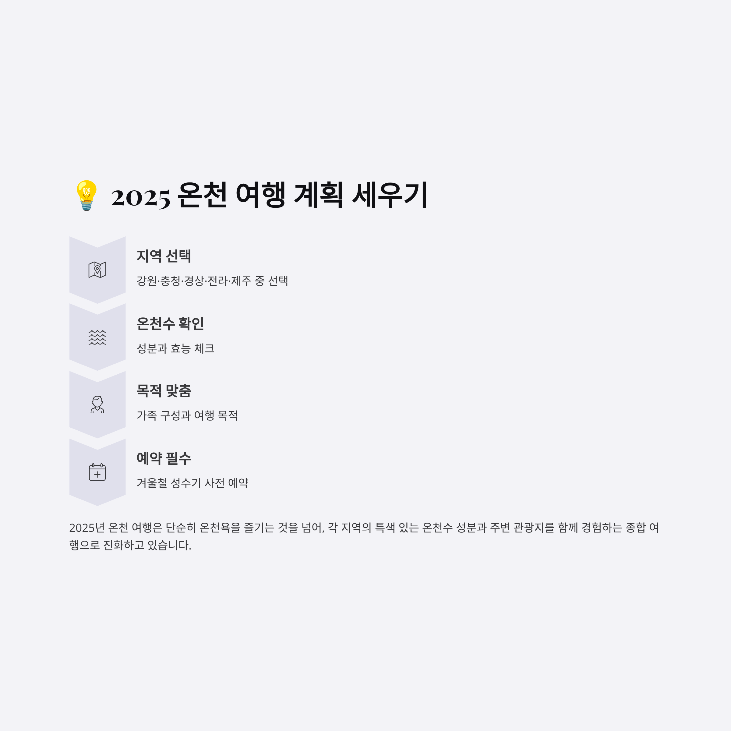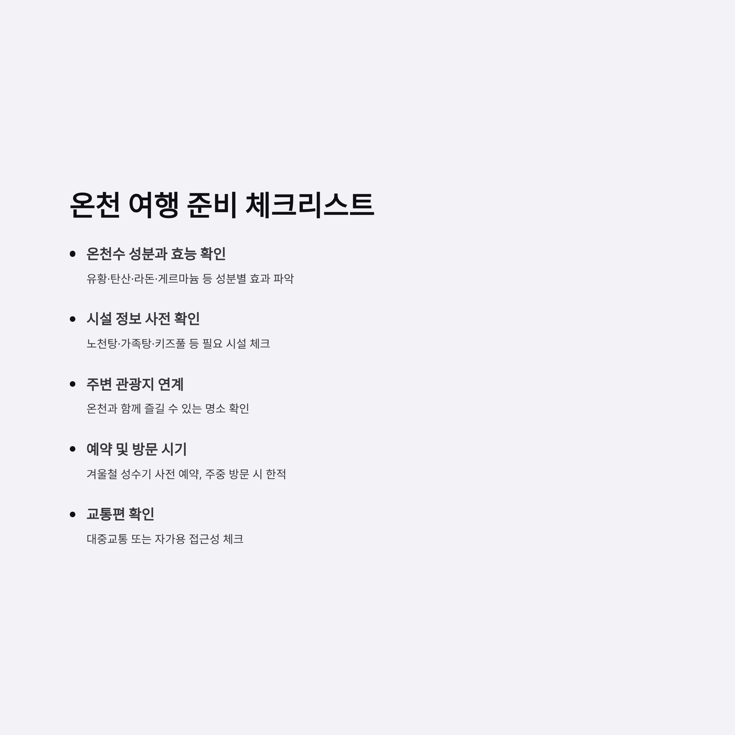 온천 여행을 계획할 때는 온천수 성분과 효능을 먼저 확인하고, 가족 구성과 여행 목적에 맞는 시설을 선택하는 것이 중요합니다.