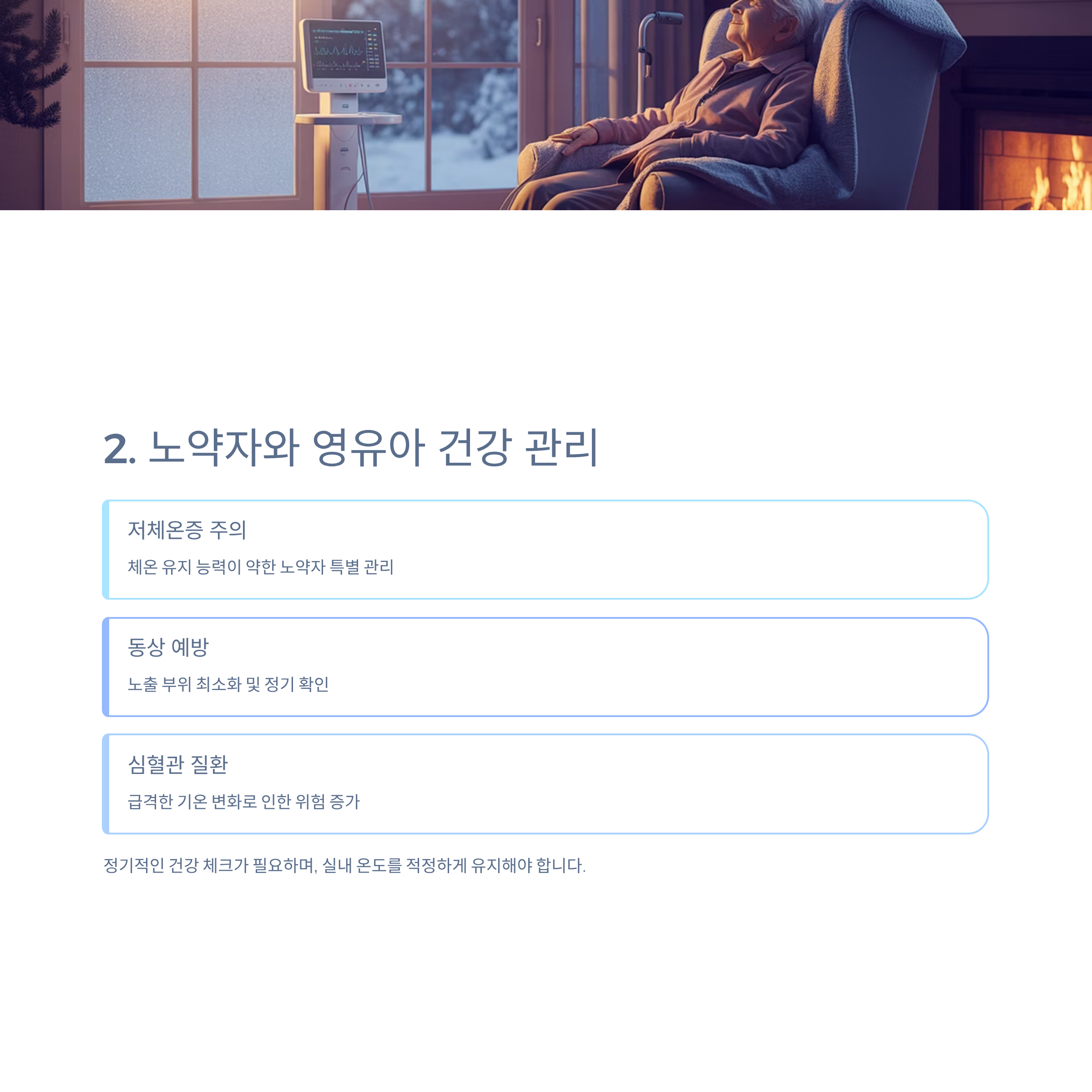 둘째, 노약자와 영유아의 건강을 특별히 관리해야 합니다. 저체온증, 동상, 심혈관 질환 등의 위험이 증가하므로 정기적인 건강 체크가 필요합니다.