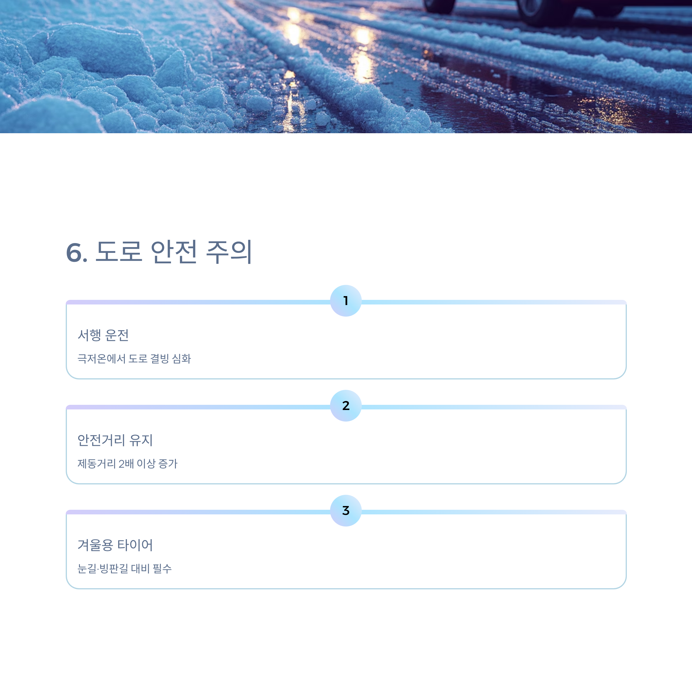 여섯째, 도로 안전에 주의해야 합니다. 극저온에서는 도로의 얼음 결빙이 심하므로 서행과 안전거리 유지가 필수입니다.