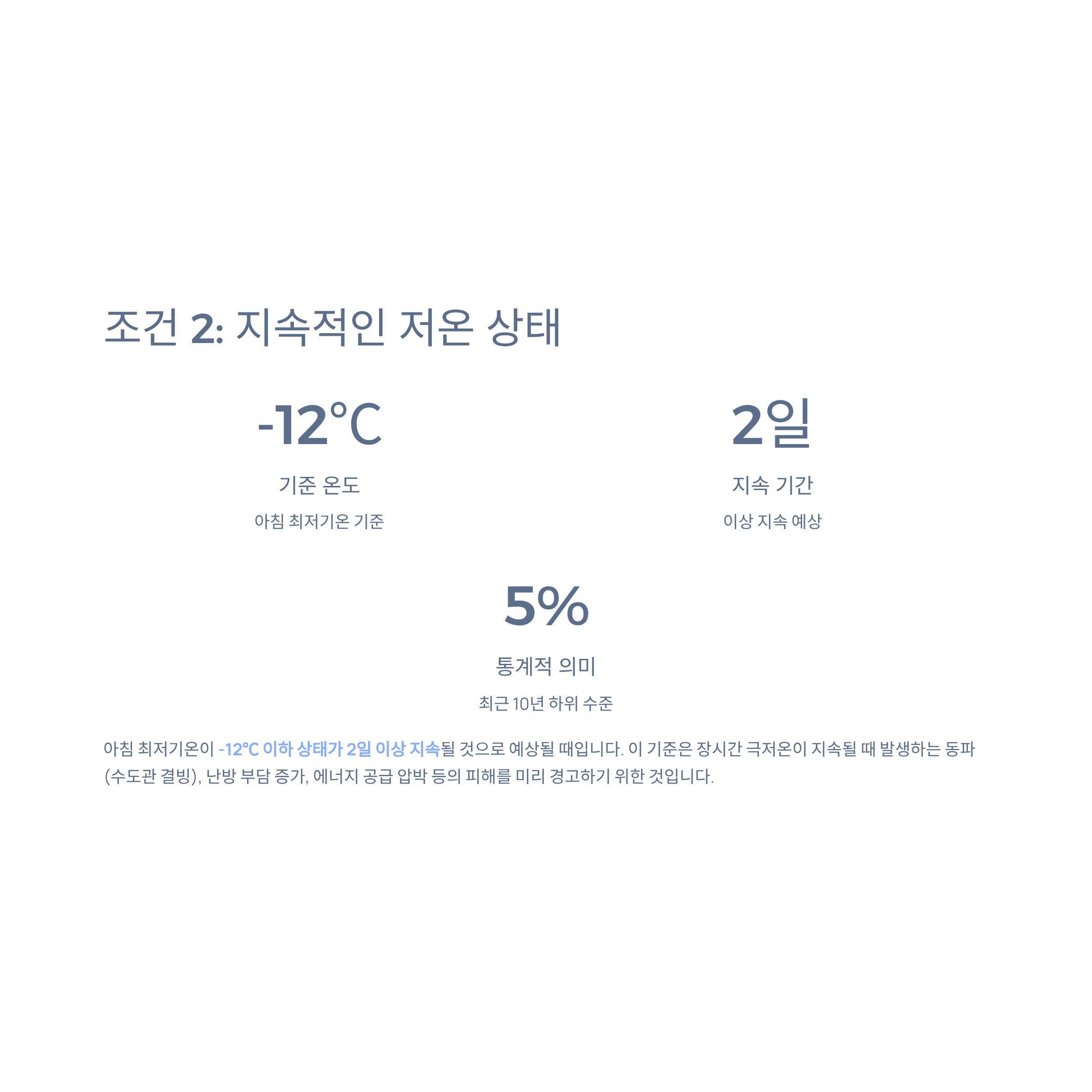이 기준은 장시간 극저온이 지속될 때 발생하는 동파(수도관 결빙), 난방 부담 증가, 에너지 공급 압박 등의 피해를 미리 경고하기 위한 것입니다.